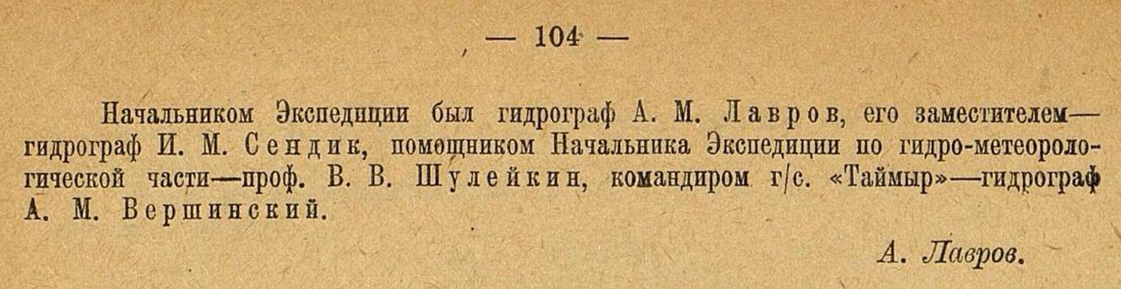 Начальником Экспедиции был гидрограф А. М. Лавров, его заместителем — гидрограф И. М. Сендик, помощником Начальника Экспедиции по гидро-метеорологической части — проф. В. В. Шулейкин, командиром г/с. «Таймыр» — гидрограф А. М. Вершинский.