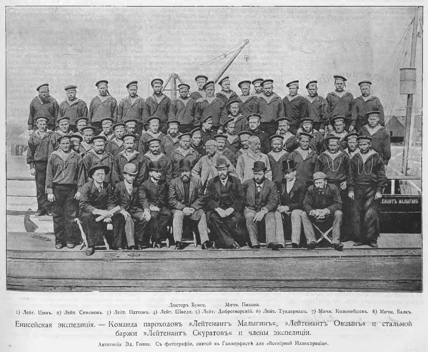 Енисейская Экспедиція была составлена изъ двухъ отрядовъ. Первая партія состояла изъ судовъ подъ военнымъ флагомъ: парохода «Лейтенантъ Овцынъ», парохода «Лейтенантъ Малыгинъ» и парусной баржи «Лейтенантъ Скуратовъ», названныхъ именами доблестныхъ сподвижниковъ Великой Сѣверной Экспедиціи 1734-1743 г. г.