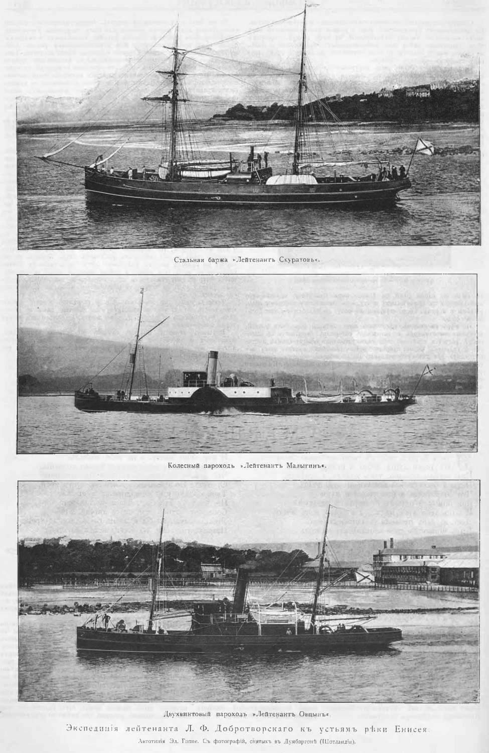 Мы уже поместили во «Всемирной Иллюстрации» (№ 1289) рисунок, изображающий группу команды судов, вошедших в состав экспедиции, и лиц, участвовавших в ней. Теперь мы даем рисунки трех судов енисейской экспедиции и портрет начальника ее, лейтенанта Добротворского. О судах «Лейтенант Овцын», «Лейтенант Малыгин» и «Лейтенант Скуратов» у нас уже было упомянуто и нам остается привести несколько данных о Л. Ф. Добротворском. Начальник енисейской экспедиции лейтенант Леонид Федорович Добротворский родился 17-го апреля 1856 г. в г. Подольске, московской губ., и воспитывался в морском кадетском корпусе, откуда выпущен гардемарином в 1877 г. На следующий год он отправился в плавание в Америку на «Цимбрии». Затем мичманом и лейтенантом, он плавал на судах балтийского флота, командовал миноносками и совершил кругосветное плавание на крейсере «Адмирал Нахимов» в эскадре Наследника Цесаревича. Вскоре по возвращении в Россию Л. Ф. Добротворский назначен был в экспедицию к устьям Енисея и, как известно, это последнее плавание закончил вполне блистательно.