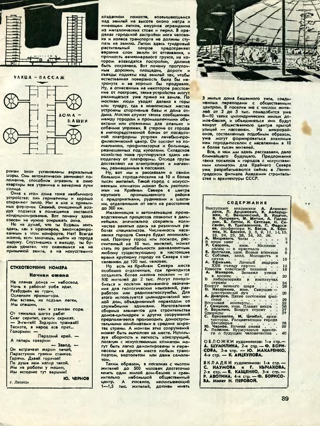 Холода, бураны, метели — все это останется по ту сторону гигантского кольца семи-девяти-этажных зданий из стекла и бетона. В этих зданиях будет все, что необходимо для жизни четырех тысяч человек. Морской причал соединится с городом крытой улицей-галереей для пешеходов и электротранспорта. Макет этого города-порта на побережье Ледовитого океана, созданный по проекту архитекторов Ленинградского зонального научно-исследовательского института типового и экспериментального проектирования, вызвал большой интерес у посетителей Советского павильона на Всемирной выставке в Монреале.