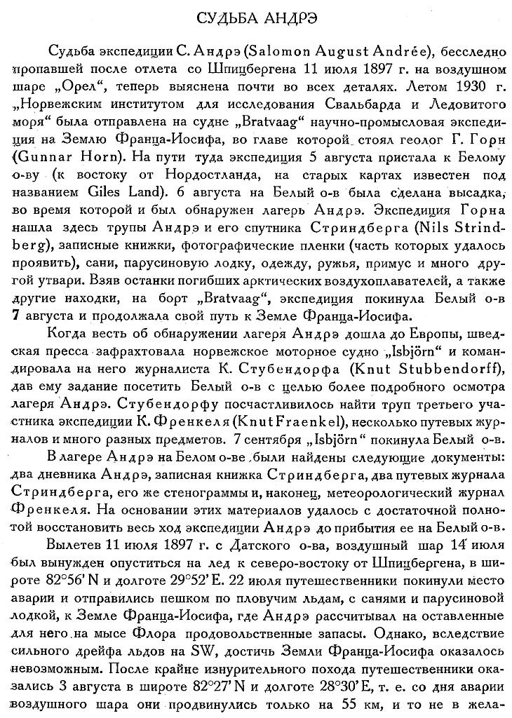 На основании материалов, найденных на Белом о-ве, Шведским Обществом антропологии и географии издан труд, посвященный экспедиции Андрэ, „Med Ornen mot Polen". {1} В нем in extenso приводится содержание дневников Андрэ и Стриндберга, а также помещены 12 фотографий, заснятых Андрэ и проявленных 33 года спустя.