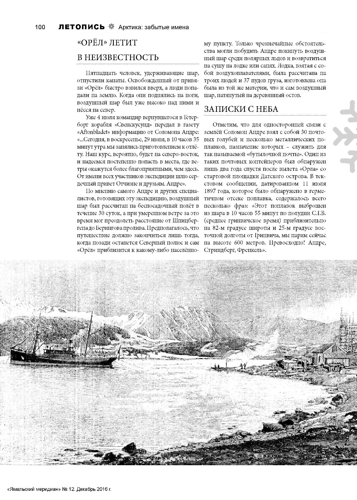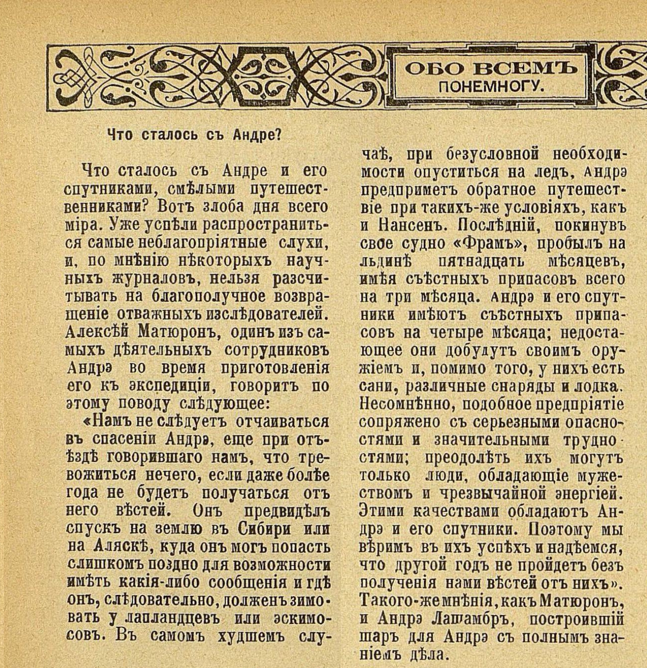 «В последнее время и печать и публика очень много занимались вопросом об участи знаменитого воздухоплавателя Андре. рискнувшего отправиться на воздушном шаре к неведомому до сих пор Северному полюсу... Напечатанное ниже начало дневника имеет, несомненно, громадное значение, так как дневник этот есть до сих пор единственный документ, взятый из реальной действительности, и по всем признакам принадлежал перу знаменитого воздухоплавателя».