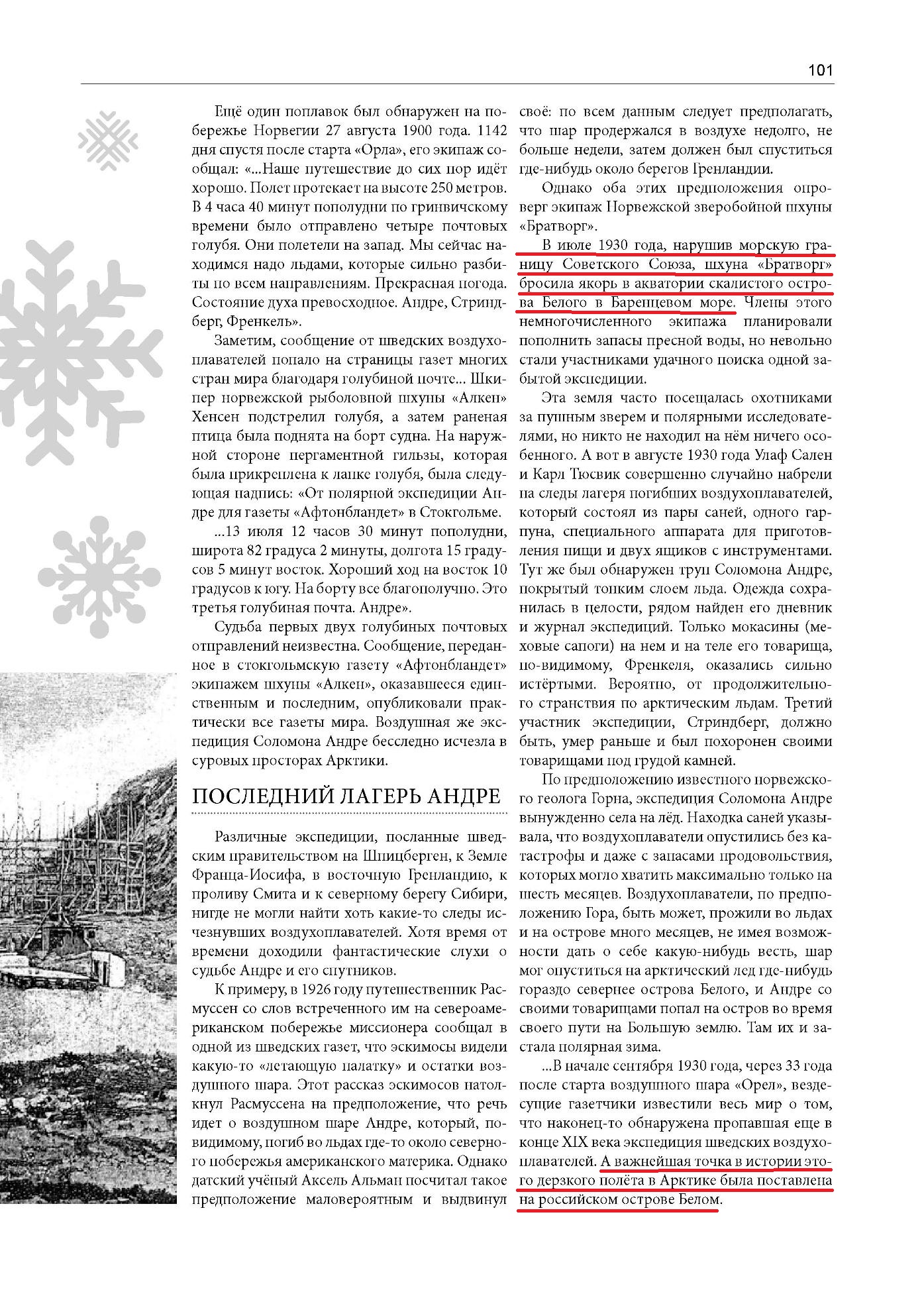 — Господин Хорн, — обратился он к руководителю экспедиции, — мне сдается, что мои парни нашли лагерь Андрэ. — И Элиассен протянул какую-то тетрадь, мокрую и тяжелую. На первой странице можно было разобрать несколько слов: «...санное путешествие 1897 года».