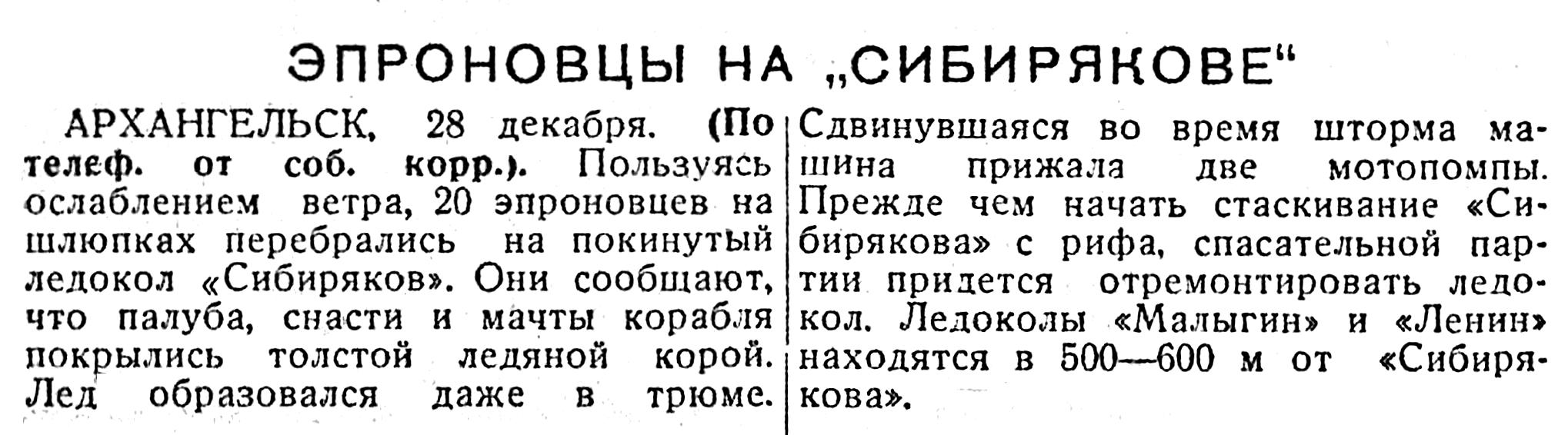АРХАНГЕЛЬСК, 28 декабря. (По телеф. от соб. корр.). Пользуясь ослаблением ветра, 20 эпроновцев на шлюпках перебрались на покинутый ледокол «Сибиряков». Они сообщают, что палуба, снасти и мачты корабля покрылись толстой ледяной корой. Лед образовался даже в трюме.
