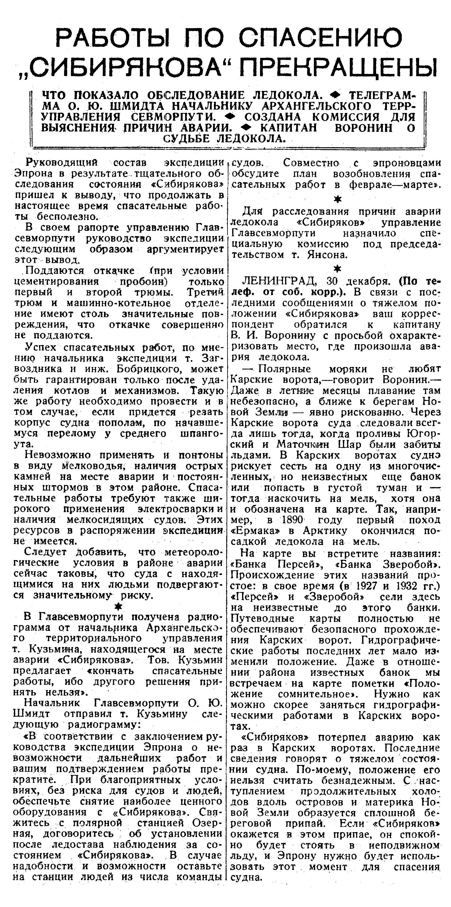 В Главсевморпути получена радиограмма от начальника Архангельского территориального управления т. Кузьмина, находящегося на месте аварии «Сибирякова». Тов. Кузьмин предлагает «кончать спасательные работы, ибо другого решения принять нельзя».