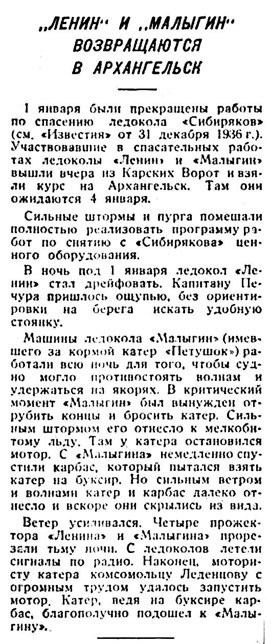 1 января были прекращены работы по спасению ледокола «Сибиряков» (см. «Известия» от 31 декабря 1936 г.). Участвовавшие в спасательных работах ледоколы «Ленин» и «Малыгин» вышли вчера из Карских Ворот и взяли курс на Архангельск. Там они ожидаются 4 января.