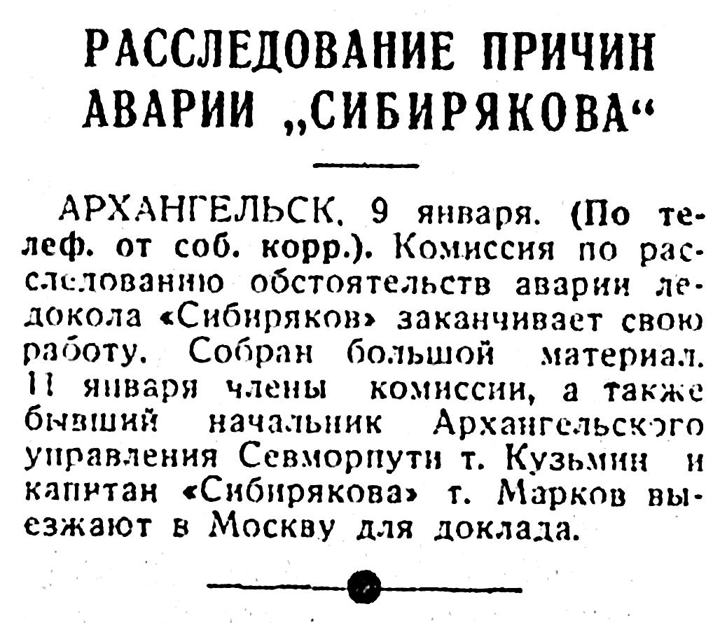 Для расследования причин аварии ледокола «Сибиряков» управление Главсевморпути назначило специальную комиссию под председательством т. Янсона.