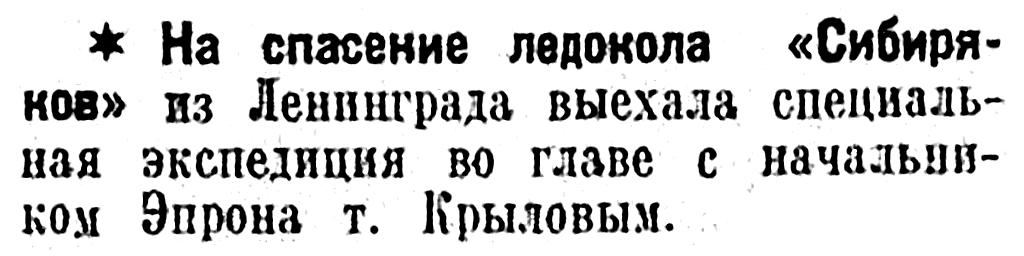 * На спасение ледокола «Сибиряков» из Ленинграда выехала специальная экспедиция во главе с начальником Эпрона т. Крыловым.