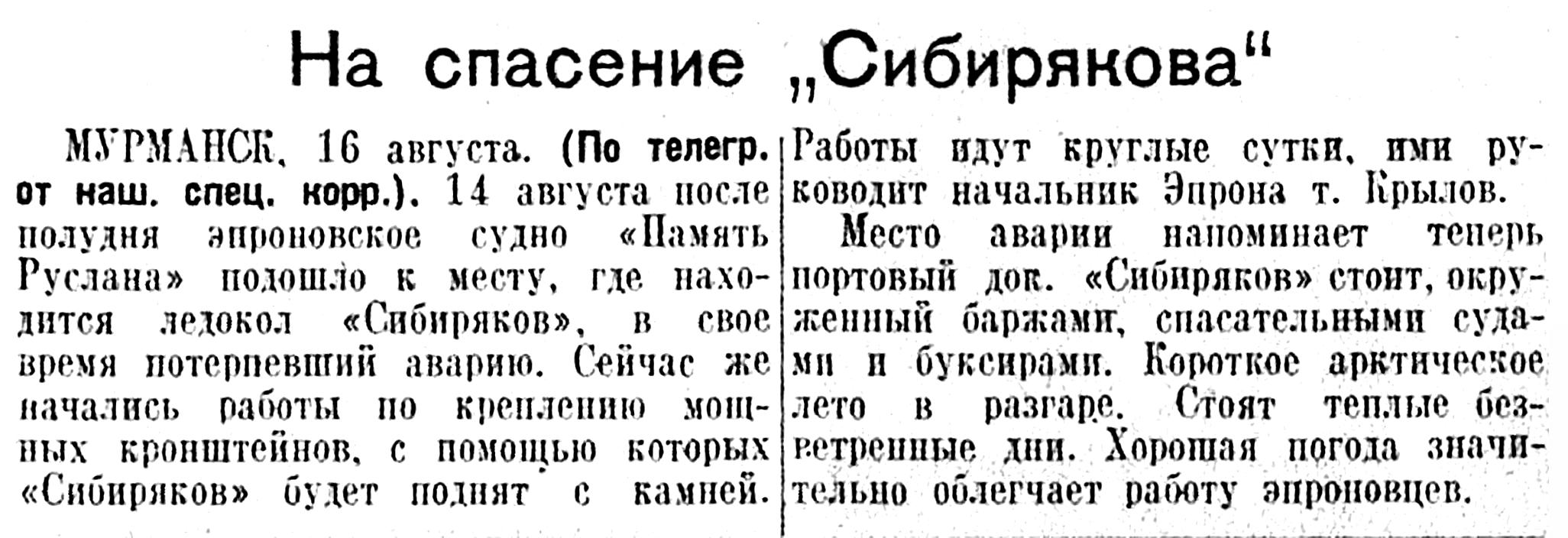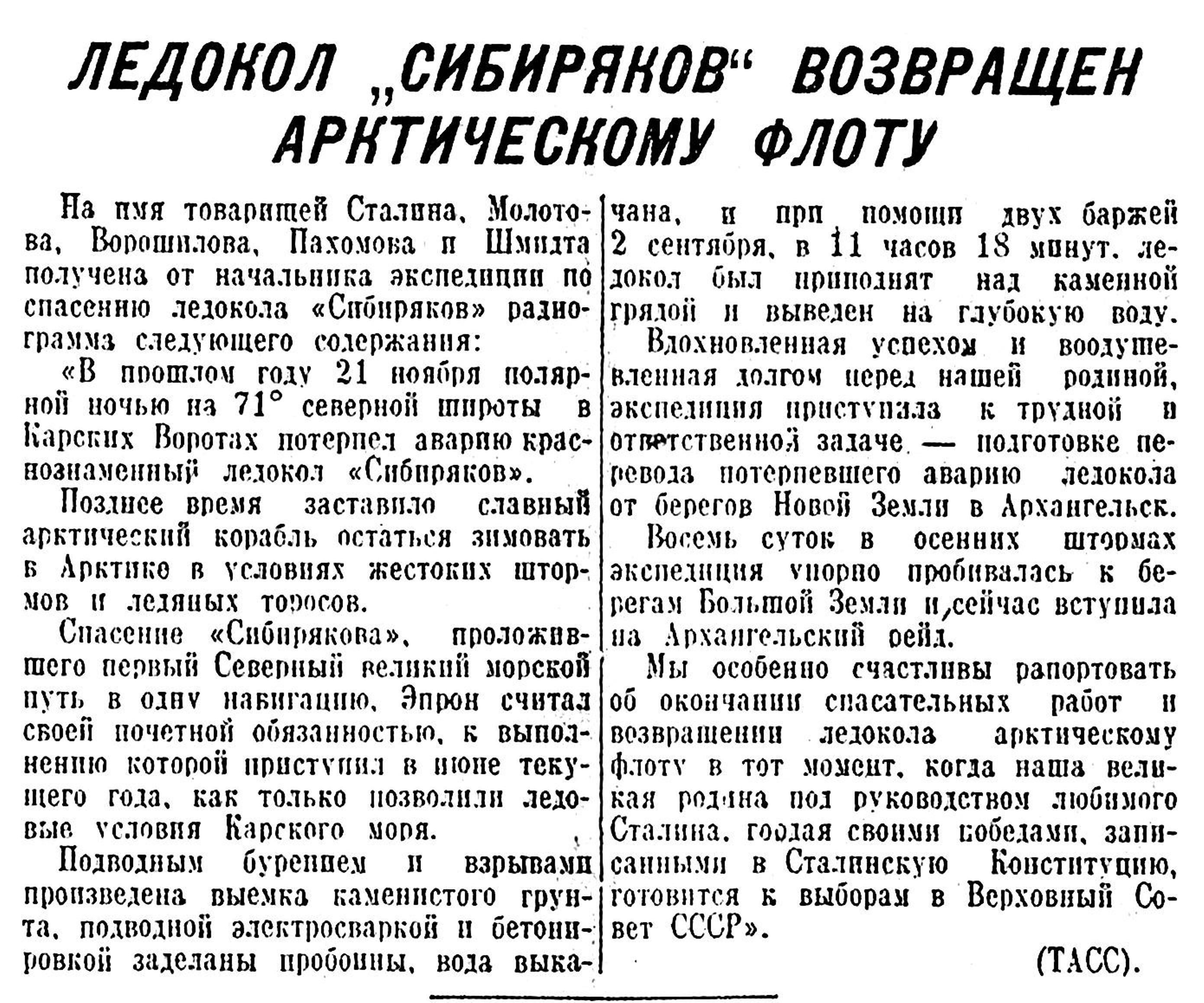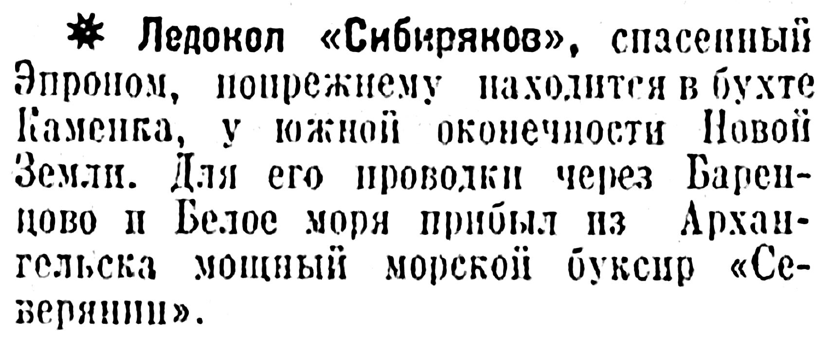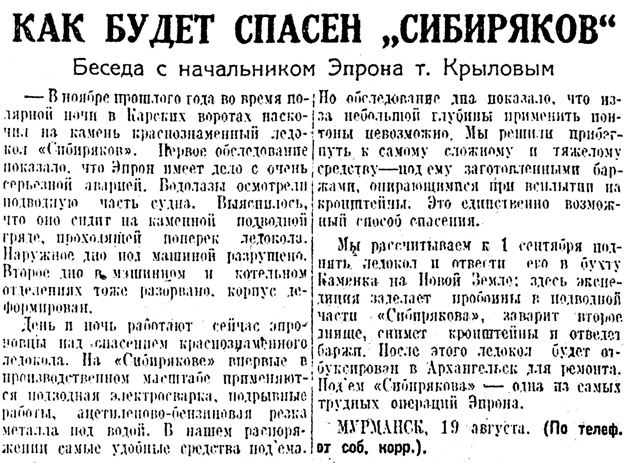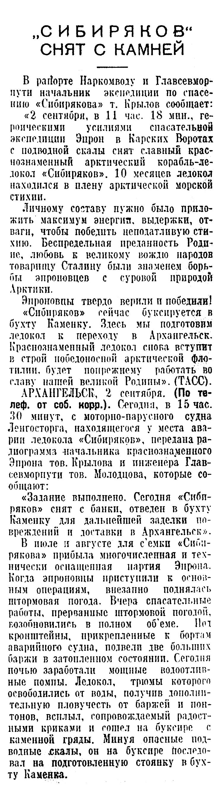 «2 сентября, в 11 час. 18 мин., героическими усилиями спасательной экспедиции Эпрон в Карских Воротах с подводной скалы снят славный краснознаменный арктический корабль-ледокол «Сибиряков». 10 месяцев ледокол находился в плену арктической морской стихии.