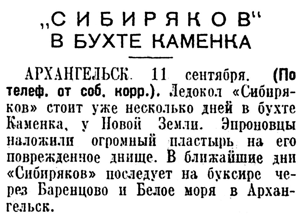 АРХАНГЕЛЬСК. 11 сентября. (По телеф. от соб. корр.). Ледокол «Сибиряков» стоит уже несколько дней в бухте Каменка, у Новой Земли. Эпроновцы наложили огромный пластырь на его поврежденное днище. В ближайшие дни «Сибиряков» последует на буксире через Баренцево и Белое моря в Архангельск.