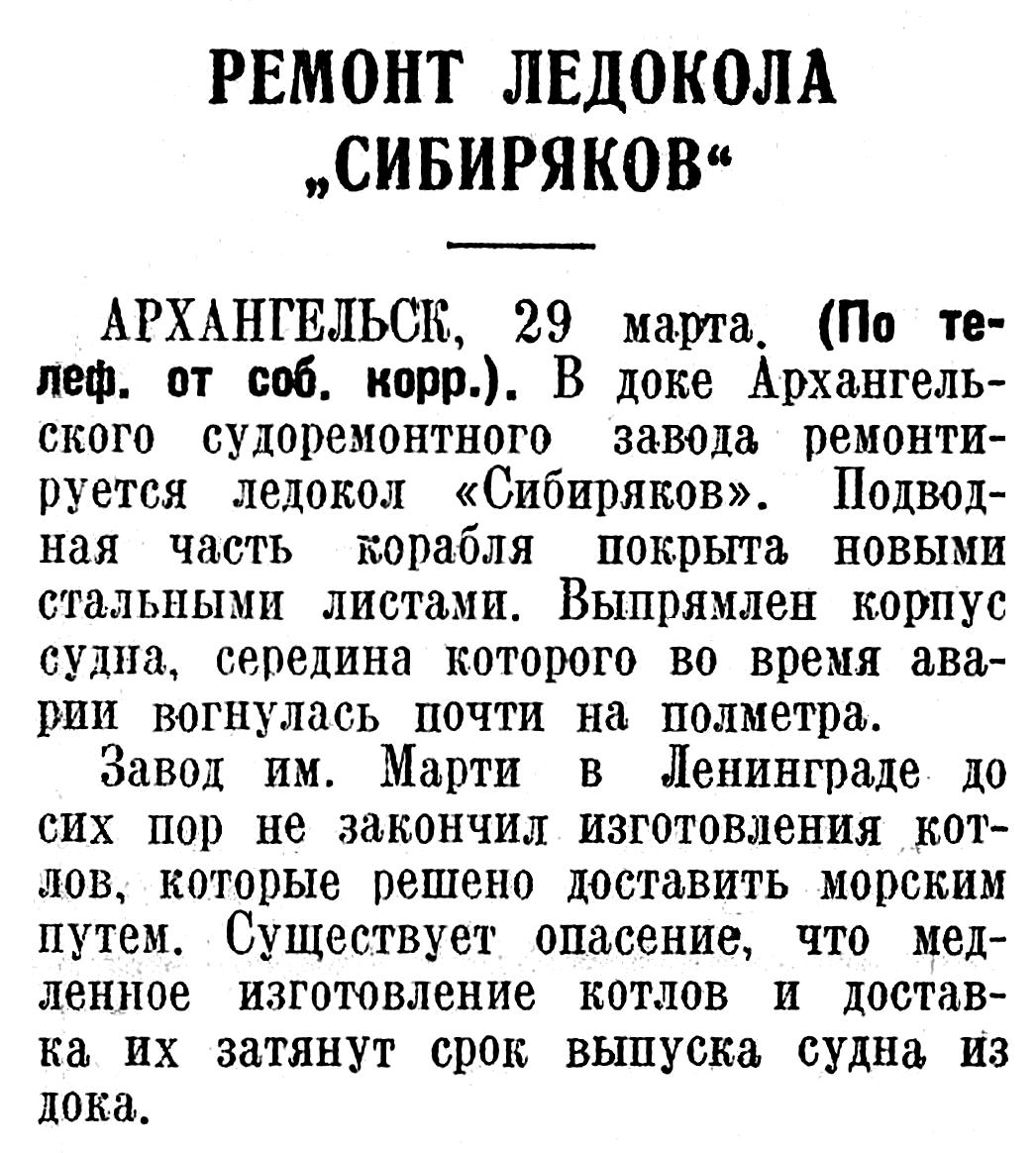 АРХАНГЕЛЬСК, 29 марта. (По телеф. от соб. корр.). В доке Архангельского судоремонтного завода ремонтируется ледокол «Сибиряков». Подводная часть корабля покрыта новыми стальными листами. Выпрямлен корпус судна, середина которого во время аварии вогнулась почти на полметра.