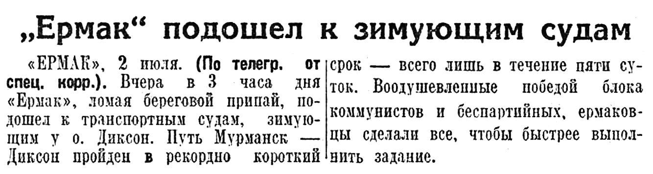 «ЕРМАК», 2 июля. (По телегр. от спец. корр.). Вчера в 3 часа дня «Ермак», ломая береговой припай, подошел к транспортным судам, зимующим у о. Диксон. Путь Мурманск — Диксон пройден в рекордно короткий срок — всего лишь в течение пяти суток. Воодушевленные победой блока коммунистов и беспартийных, ермаковцы сделали все, чтобы быстрее выполнить задание.