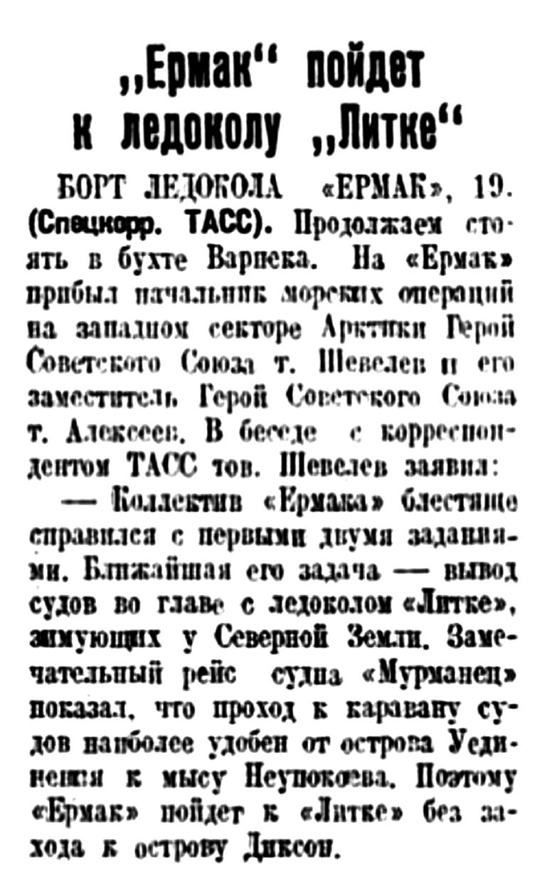БОРТ ЛЕДОКОЛА «ЕРМАК». 18. (Наш спецкор по радио). Сегодня на собрании экипажа ледокола выступил Герой Советского Союза тов. Шевелев. Он отметил энергичную работу экипажа в выполнение двух больших операций похода на Землю Франца-Иосифа и к острову Диксон.