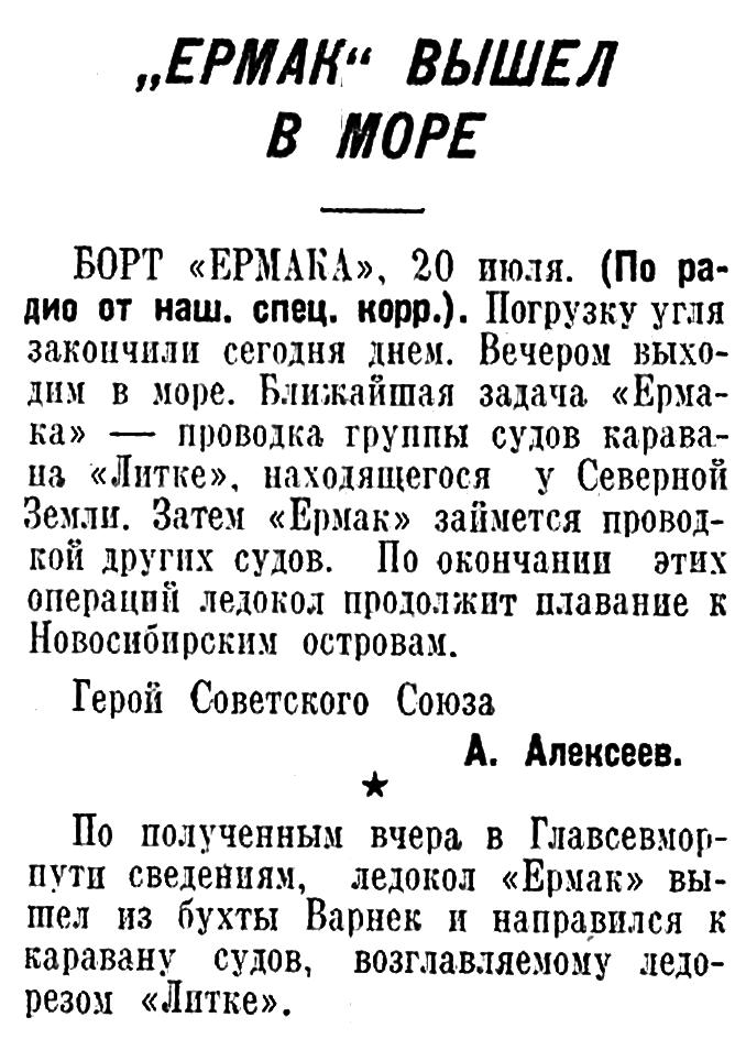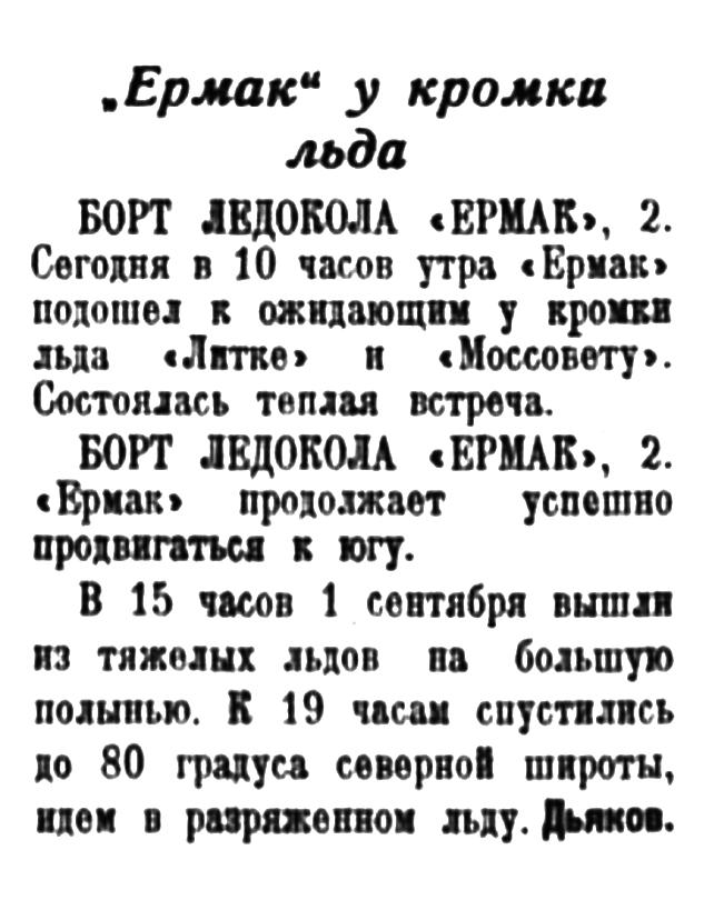 Борт ледокола «Ермак». (Наш спецкорр. по радио). «Ермак» в 0 час. 30 мин. вышел с острова Диксон. Под проводкой ледокола в кильватерной колонне идут 6 транспортов, зимовавших в районе Диксона. Во время стоянки у острова все пароходы были снабжены ледоколом продовольствием, углем и водой. «Ермак» проведет весь транспорт до Югорского пролива, откуда они пойдут в Архангельск.