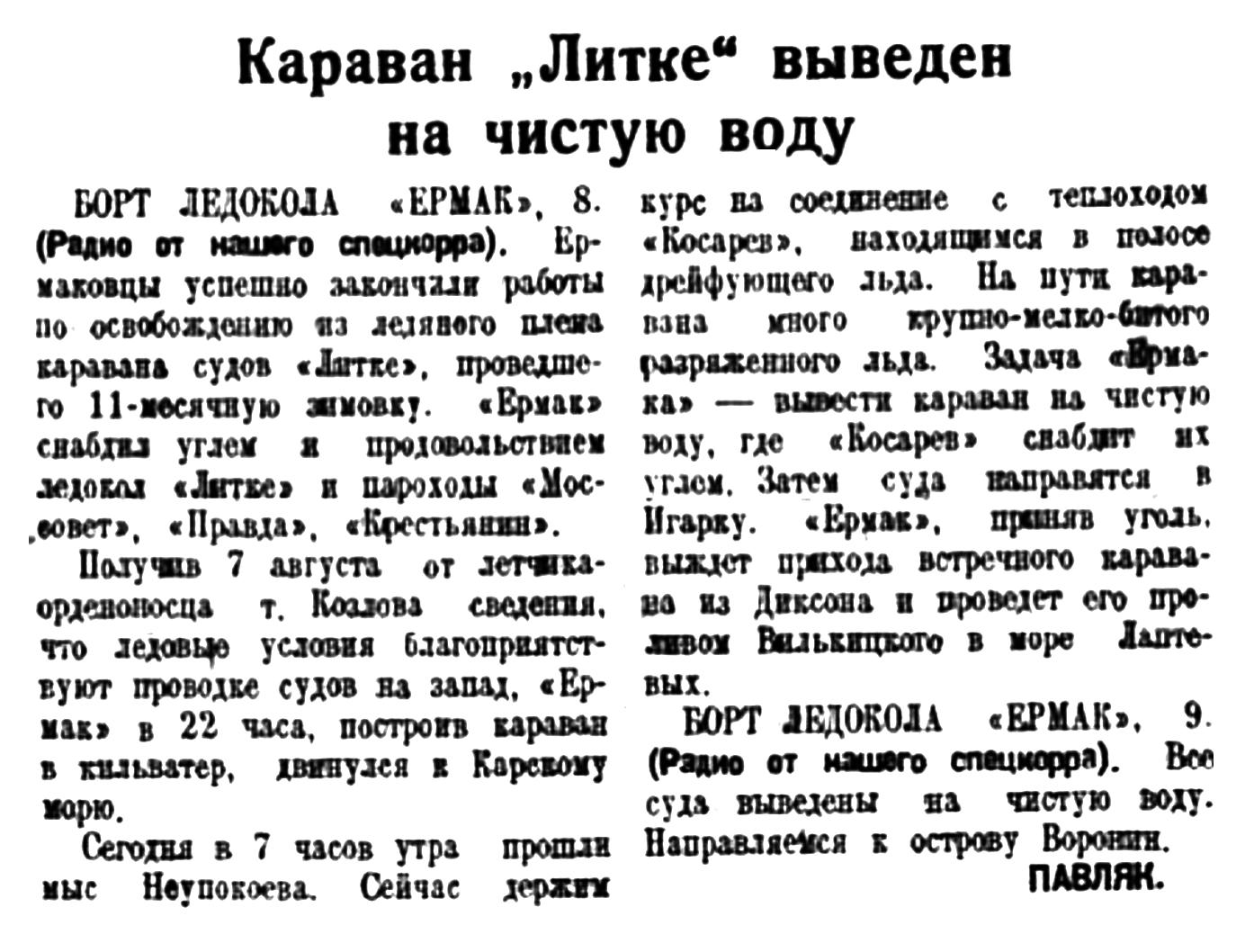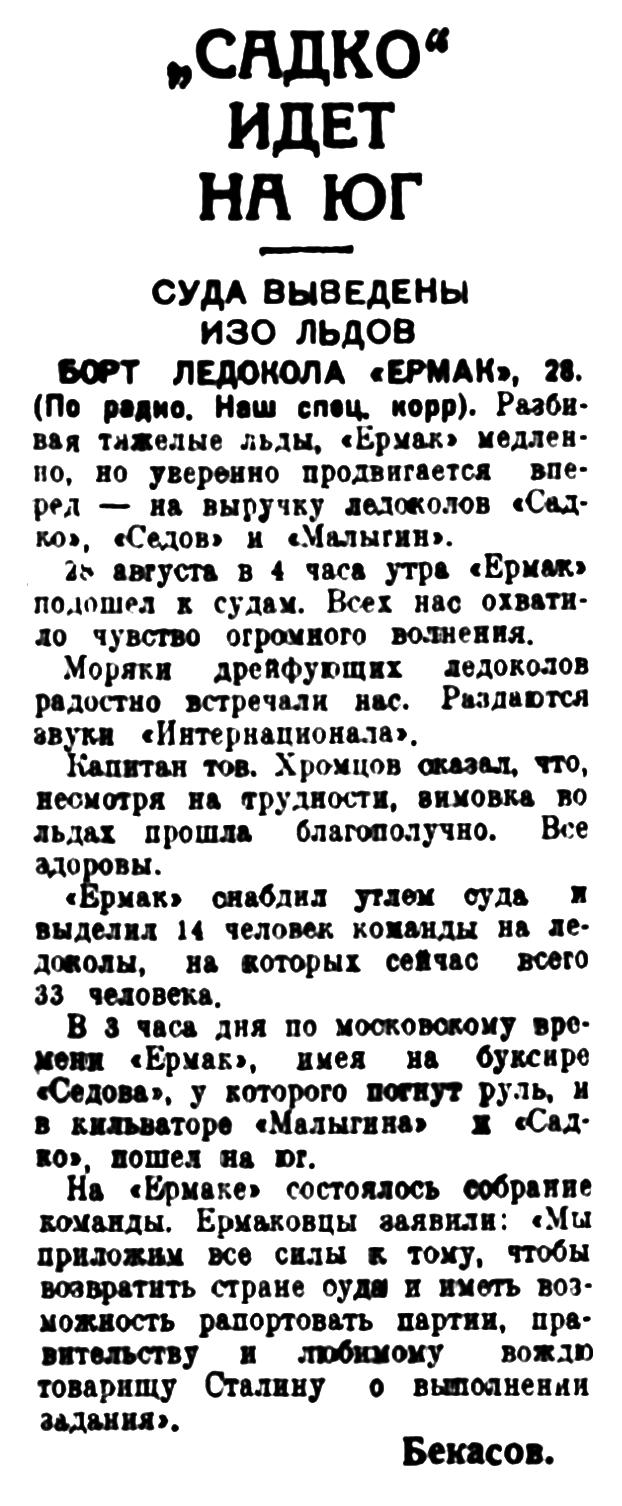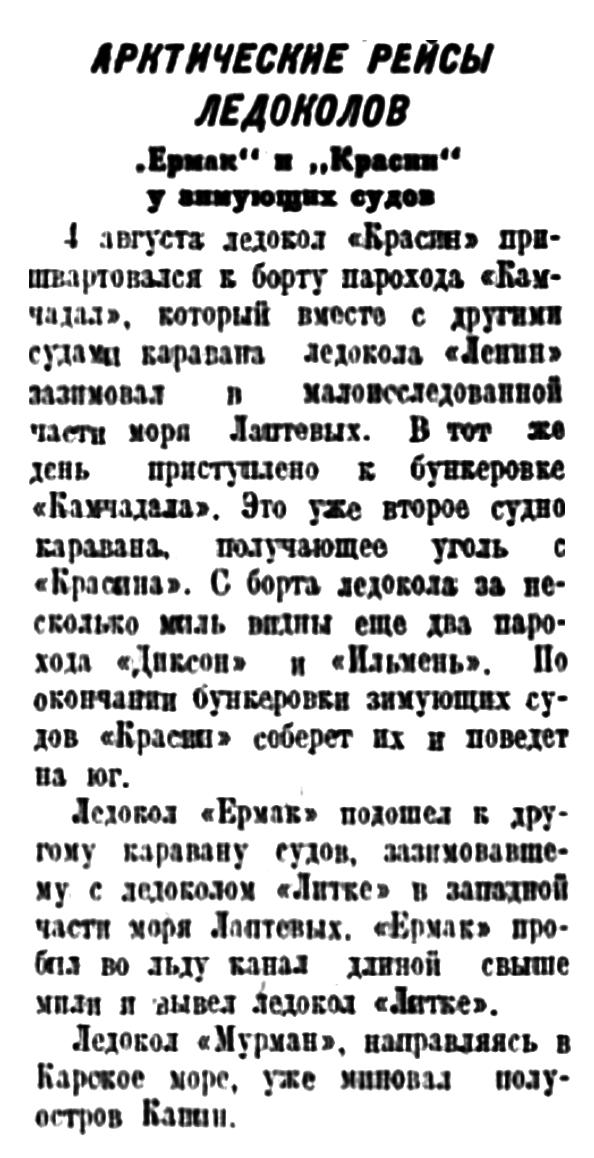 Ледокол «Красин», зимовавший в бухте Кожевникова, закончил операцию по выводу из льдов каравана «Ленина». Получена радиограмма, что все суда «Красиным» выведены на чистую воду. Таким образом, можно считать, что все суда за исключением каравана «Садко» вырваны из ледового плена.