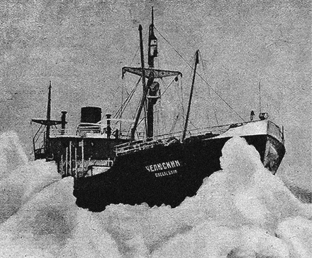 13 августа на горизонте показался первый лед. Сначала шли маленькие льдинки. Затем поплыли небольшие ледяные острова. И, наконец, показался сплошной лед. Решили испытать ледовые качества корабля. Дали полный ход. "Челюскин" с разбега врезался в льдину. Корпус задрожат от удара. Льдина дала трещину, уступая напору судна.