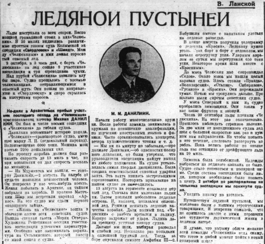 Там же - фрагмент его воспоминаний о гибели парохода «Семён Челюскин» и эвакуации на льдину.
