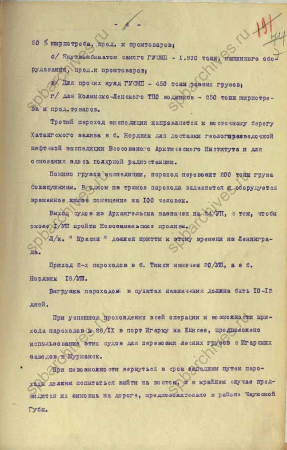 Пункт "г" "Постановления СНК СССР "Об утверждении важнейший морских экспедиций Главного управления Северного морского пути"" от 3 апреля 1933 года (ЦГАНТД по СПб, ф-369 оп-1-1 д 77 л.1) :