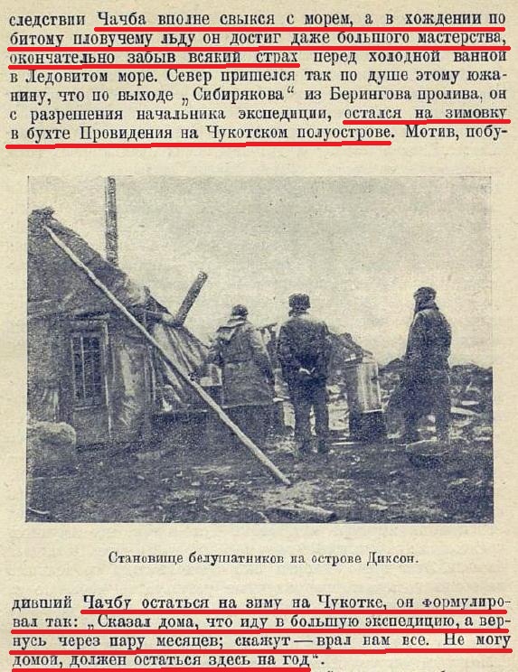 17 сентября сломался упорный подшипник, а 18 сентября, недалеко от о-ва Идлидля, ледокол потерпел еще более серьезную аварию — сломался конец гребного вала и вместе с винтом упал в море. Дрейфовавший в сплоченном тяжелом льду (9—10 баллов) ледокол, после многочисленных зигзагов и петель, описанных под влиянием течения (которое вдоль самого берега, повидимому, направлено в сторону Берингова пролива) и ветров, 27 сентября, восточнее мыса Сердце-Камень, в расстоянии 16 миль от берега, был вынесен в более разреженный лед. В тот же день были поставлены самодельные паруса из имевшихся на борту брезентов. Временами закрепляя тросы за стамухи и подтягиваясь, временами взрывая лед аммоналом, „Сибиряков“ 1 октября в 14 ч. 45 м. вышел