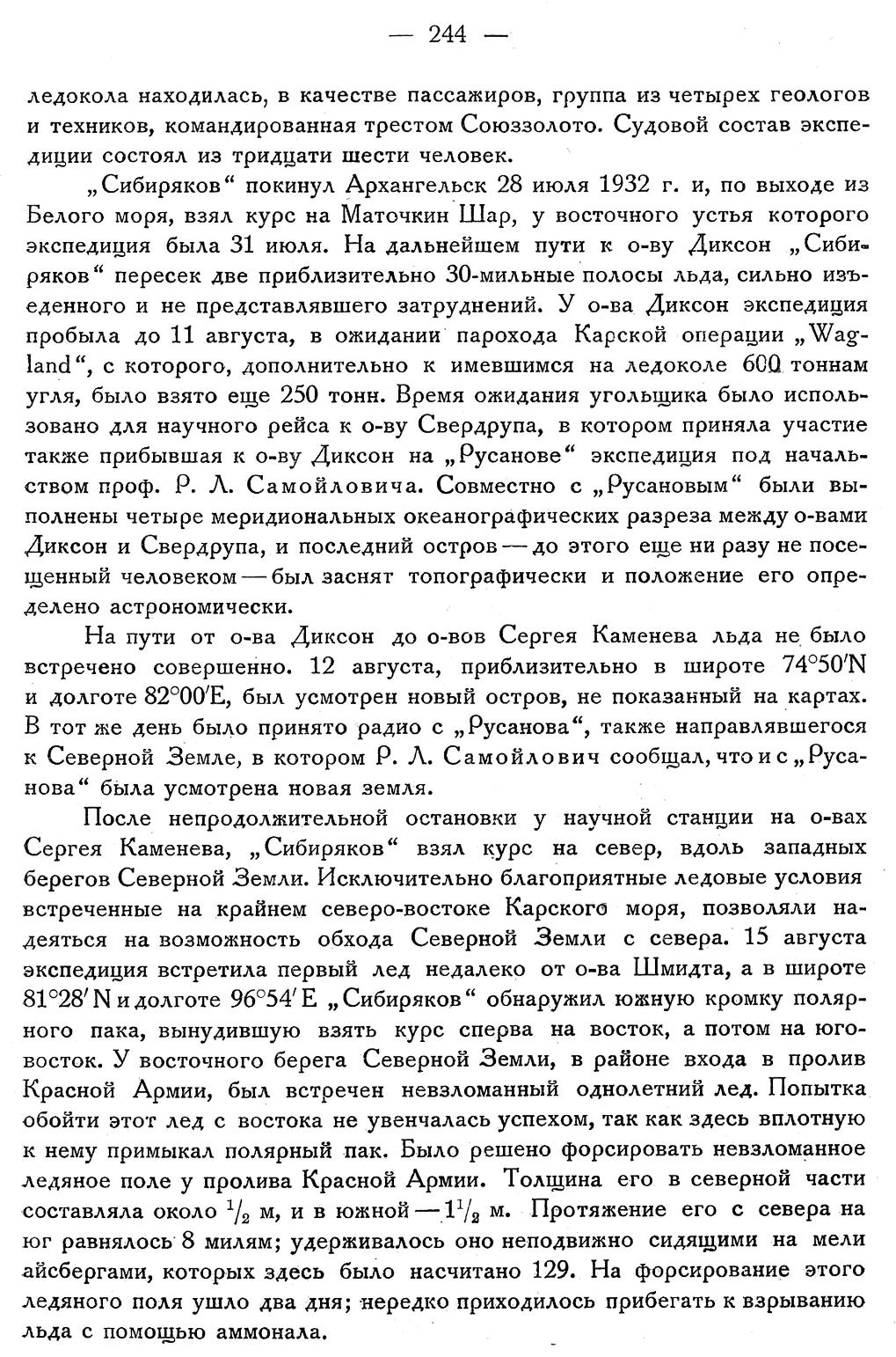 На пути от о-ва Диксон до о-вов Сергея Каменева льда не было встречено совершенно. 12 августа, приблизительно в широте 74°50'N и долготе 82°00/Е, был усмотрен новый остров, не показанный на картах. В тот же день было принято радио с „Русанова“, также направлявшегося к Северной Земле, в котором Р. Л. Самойлович сообщал, что и с „Русанова“ была усмотрена новая земля.