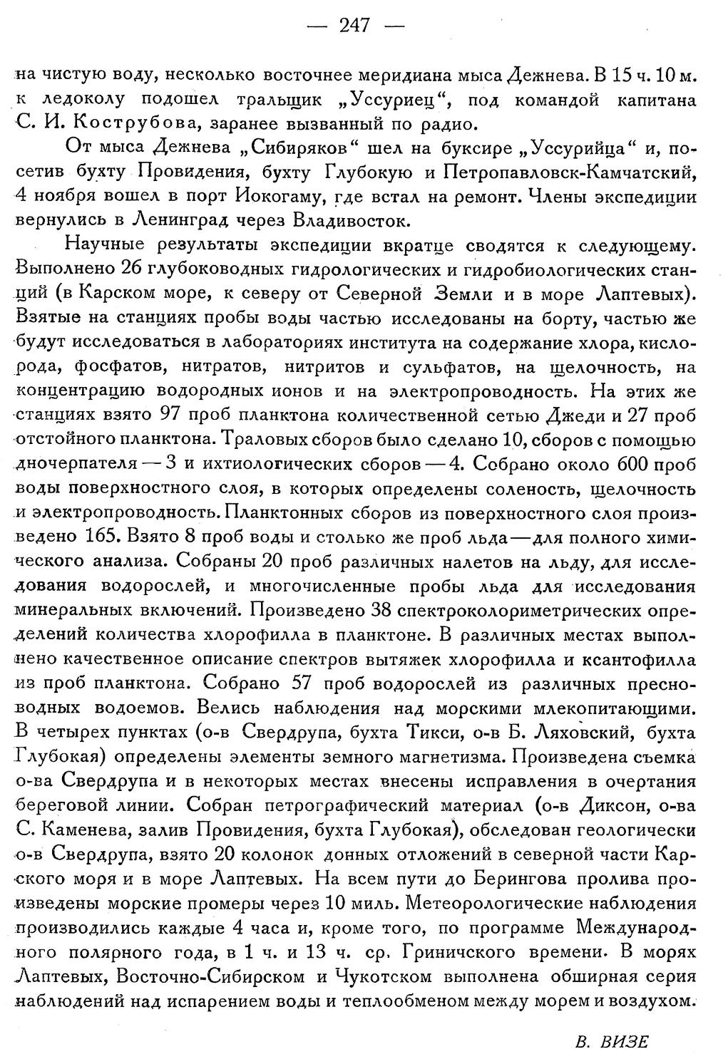 Научные результаты экспедиции вкратце сводятся к следующему. Выполнено 26 глубоководных гидрологических и гидробиологических станций (в Карском море, к северу от Северной Земли и в море Лаптевых). Взятые на станциях пробы воды частью исследованы на борту, частью же будут исследоваться в лабораториях института на содержание хлора, кислорода, фосфатов, нитратов, нитритов и сульфатов, на щелочность, на концентрацию водородных ионов и на электропроводность. На этих же станциях взято 97 проб планктона количественной сетью Джеди и 27 проб отстойного планктона. Траловых сборов было сделано 10, сборов с помощью дночерпателя — 3 и ихтиологических сборов — 4. Собрано около 600 проб воды поверхностного слоя, в которых определены соленость, щелочность и электропроводность. Планктонных сборов из поверхностного слоя произведено 165. Взято 8 проб воды и столько же проб льда — для полного химического анализа. Собраны 20 проб различных налетов на льду, для исследования водорослей, и многочисленные пробы льда для исследования минеральных включений. Произведено 38 спектроколориметрических определений количества хлорофилла в планктоне. В различных местах выполнено качественное описание спектров вытяжек хлорофилла и ксантофилла из проб планктона. Собрано 57 проб водорослей из различных пресноводных водоемов. Велись наблюдения над морскими млекопитающими. В четырех пунктах (о-в Свердрупа, бухта Тикси, о-в Б. Ляховский, бухта Глубокая) определены элементы земного магнетизма. Произведена съемка о-ва Свердрупа и в некоторых местах внесены исправления в очертания береговой линии. Собран петрографический материал (о-в Диксон, о-ва С. Каменева, залив Провидения, бухта Глубокая), обследован геологически о-в Свердрупа, взято 20 колонок донных отложений в северной части Карского моря и в море Лаптевых. На всем пути до Берингова пролива произведены морские промеры через 10 миль. Метеорологические наблюдения производились каждые 4 часа и, кроме того, по программе Международного полярного года, в 1 ч. и 13 ч. ср. Гриничского времени. В морях Лаптевых, Восточно-Сибирском и Чукотском выполнена обширная серия наблюдений над испарением воды и теплообменом между морем и воздухом.