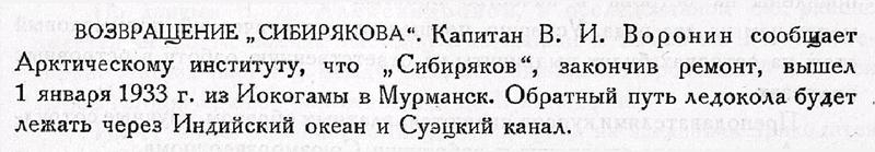 От мыса Дежнева „Сибиряков“ шел на буксире „Уссурийца“ и, посетив бухту Провидения, бухту Глубокую и Петропавловск-Камчатский, 4 ноября вошел в порт Иокогаму, где встал на ремонт. Члены экспедиции вернулись в Ленинград через Владивосток.
