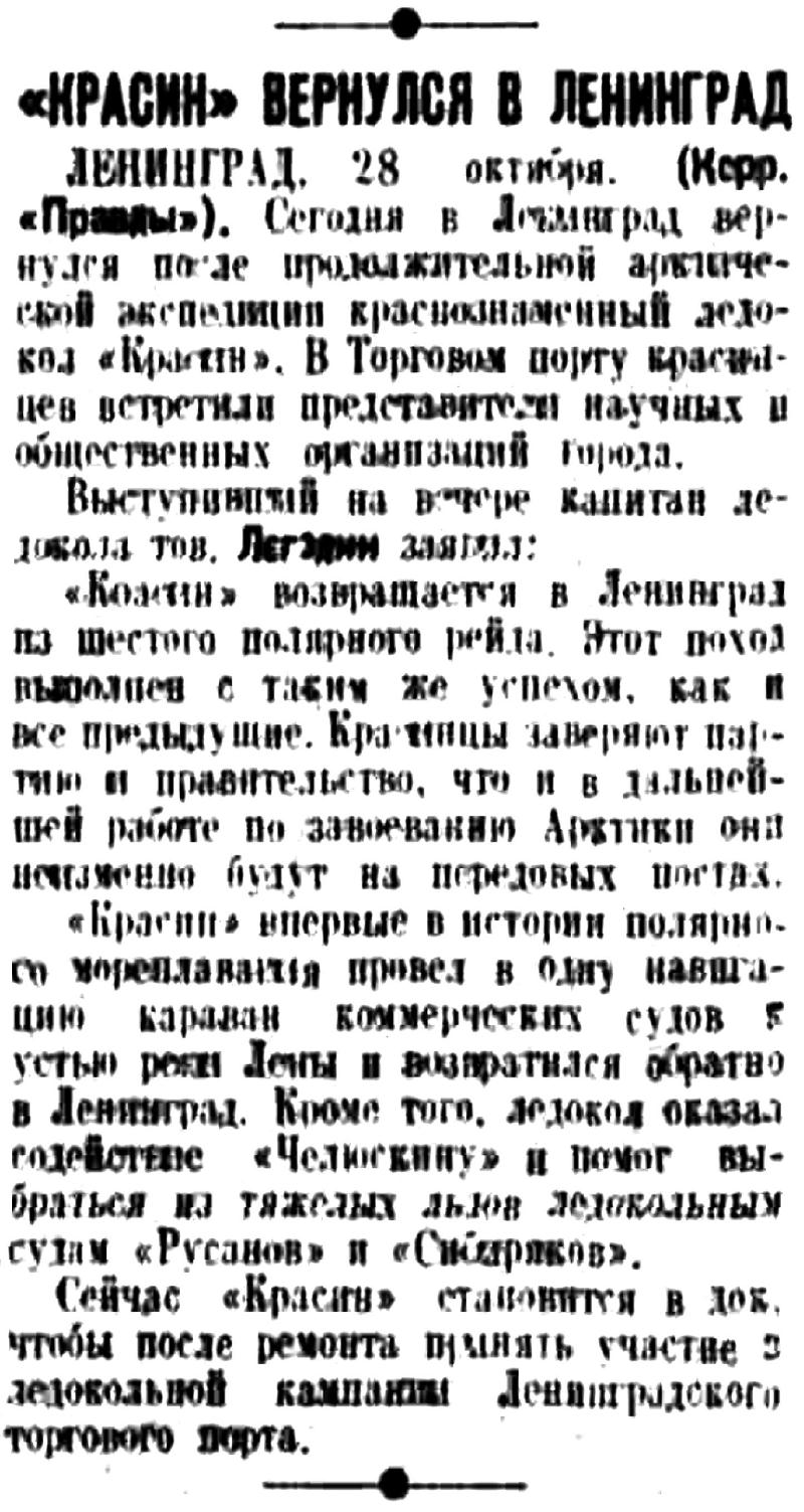 ЛЕНИНГРАД. 28 октября. (Корр. «Правды»). Сегодня в Ленинград вернулся после продолжительной арктической экспедиции краснознаменный ледокол «Красин». В Торговом порту красинцев встретили представители научных и общественных организаций города. Выступивший на вечере капитан ледокола тов. Легздин заявил:
