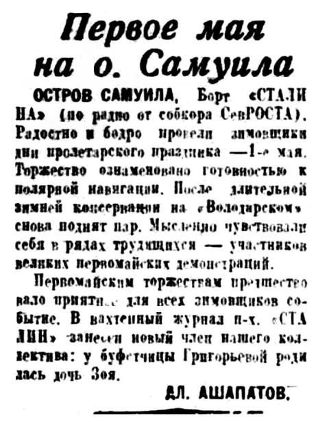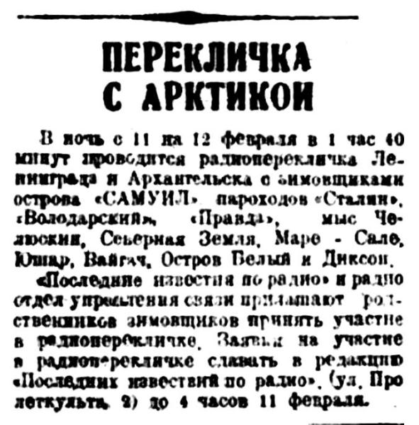 «Красин» возвращается в Ленинград из шестого полярного рейса. Этот поход выполнен с таким же успехом, как и все предыдущие. Красинцы заверяют партию и правительство, что и в дальнейшей работе по завоеванию Арктики они неизменно будут на передовых постах.