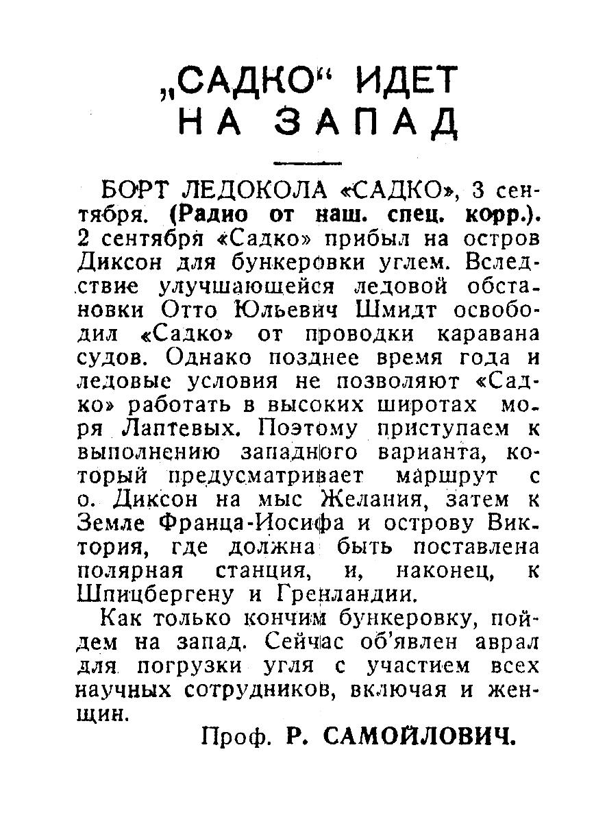 БОРТ ЛЕДОКОЛА «САДКО», 3 сентября. (Радио от наш. спец. корр.). 2 сентября «Садко» прибыл на остров Диксон для бункеровки углем. Вследствие улучшающейся ледовой обстановки Отто Юльевич Шмидт освободил «Садко» от проводки каравана судов. Однако позднее время года и ледовые условия не позволяют «Садко» работать в высоких широтах моря Лаптевых. Поэтому приступаем к выполнению западного варианта, который предусматривает маршрут с о. Диксон на мыс Желания, затем к Земле Франца-Иосифа и острову Виктория, где должна быть поставлена полярная станция, и, наконец, к Шпицбергену и Гренландии.