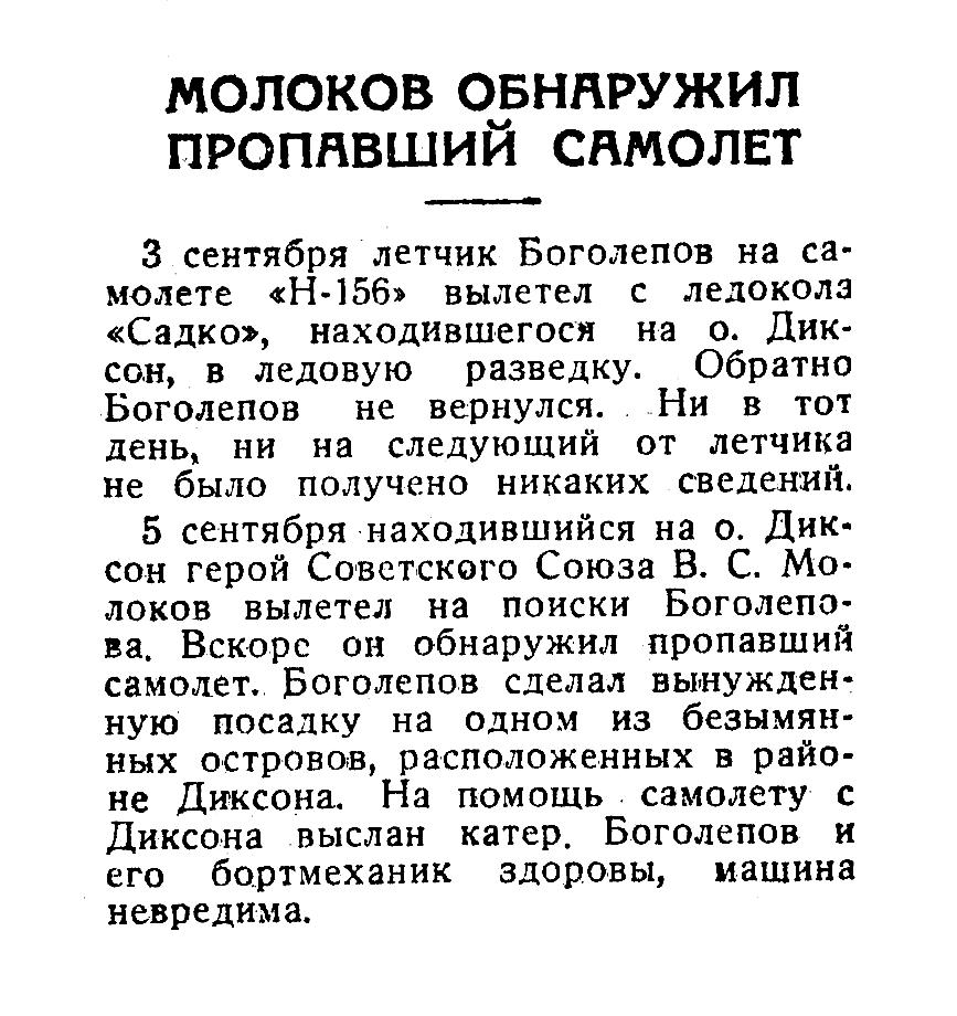 5 сентября находившийся на о. Диксон герой Советского Союза В. С. Молоков вылетел на поиски Боголепова. Вскоре он обнаружил пропавший самолет Боголепов сделал вынужденную посадку на одном из безымянных островов, расположенных в районе Диксона. На помощь самолету с Диксона выслан катер. Боголепов и его бортмеханик здоровы, машина невредима.