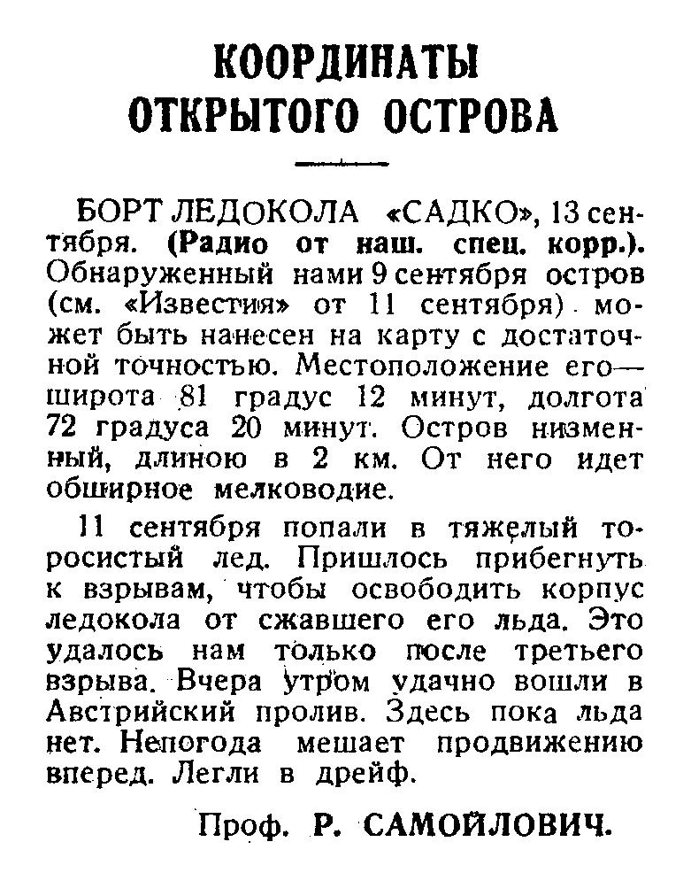 БОРТ ЛЕДОКОЛА «САДКО», 13 сентября. (Радио от наш. спец. корр.). Обнаруженный нами 9 сентября остров (см. «Известия» от 11 сентября) может быть нанесен на карту с достаточной точностью. Местоположение его — широта 81 градус 12 минут, долгота 72 градуса 20 минут. Остров низменный, длиною в 2 км. От него идет обширное мелководие.
