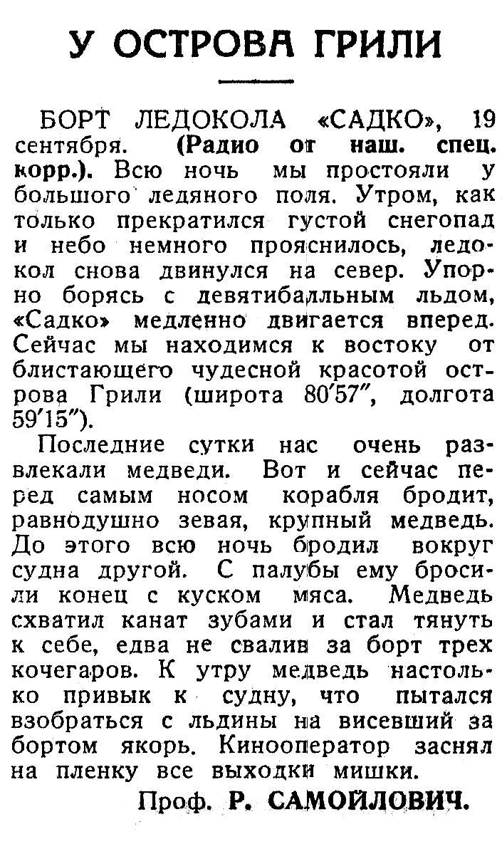 БОРТ ЛЕДОКОЛА «САДКО», 19 сентября. (Радио от наш. спец. корр.). Всю ночь мы простояли у большого ледяного поля. Утром, как только прекратился густой снегопад и небо немного прояснилось, ледокол снова двинулся на север. Упорно борясь с девятибалльным льдом, «Садко» медленно двигается вперед. Сейчас мы находимся к востоку от блистающего чудесной красотой острова Грили (широта 80˚57', долгота 59˚15').