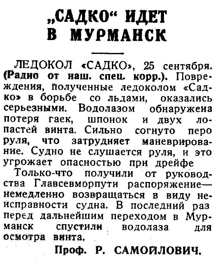 ЛЕДОКОЛ «САДКО», 25 сентября. (Радио от наш. спец. корр.). Повреждения, полученные ледоколом «Садко» в борьбе со льдами, оказались серьезными. Водолазом обнаружена потеря гаек, шпонок и двух лопастей винта. Сильно согнуто перо руля, что затрудняет маневрирование. Судно не слушается руля, и это угрожает опасностью при дрейфе. Только-что получили от руководства Главсевморпути распоряжение — немедленно возвращаться в виду неисправности судна. В последний раз перед дальнейшим переходом в Мурманск спустили водолаза для осмотра винта.