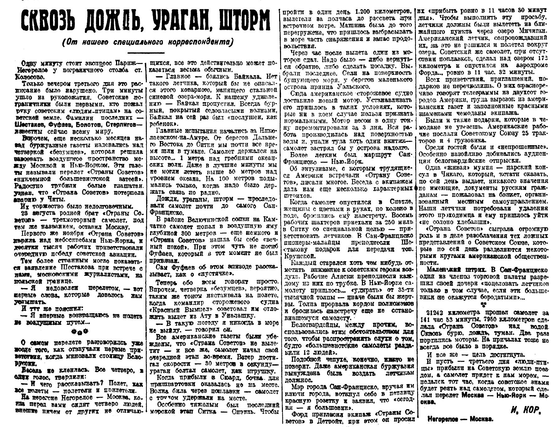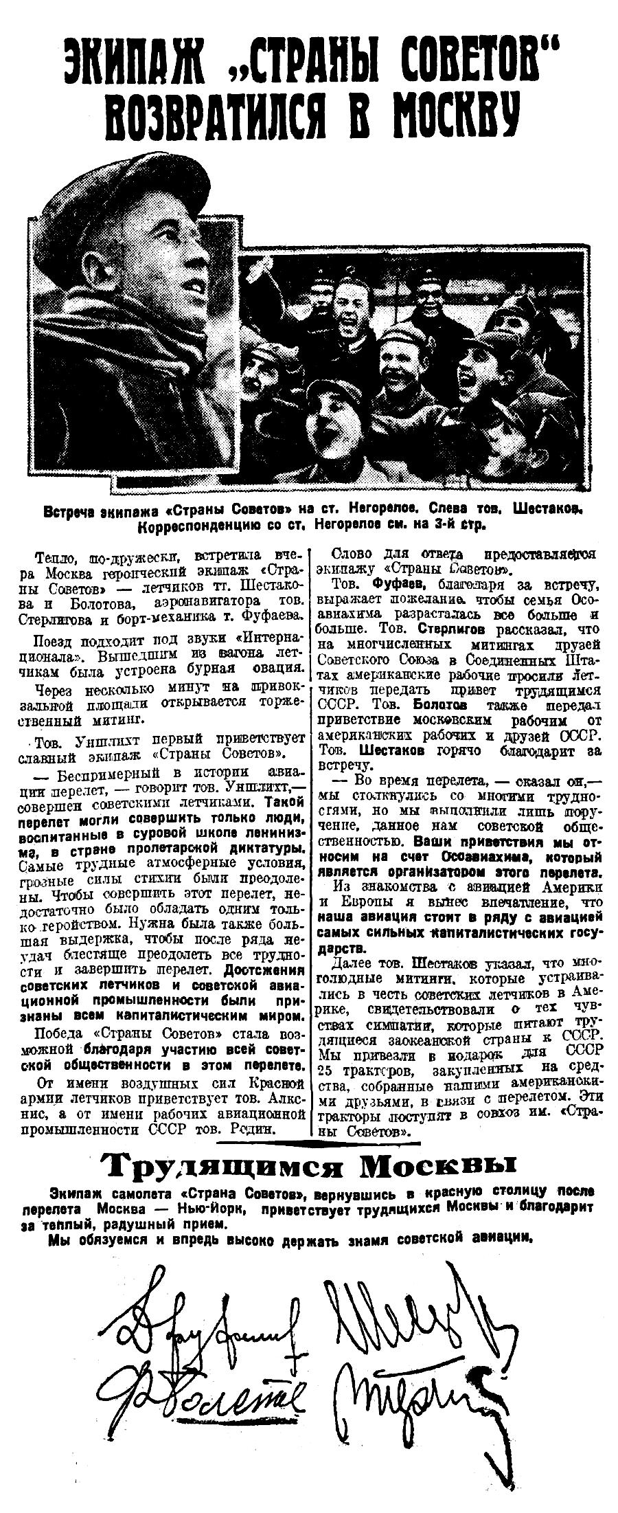 И пусть — третьего дня «люди-птицы» прибыли на Советскую землю поездом, а самолет придет к нам морем, — недалек тот час, когда советское знамя будет реять над самолетом, который сделал перелет Москва — Нью-Йорк — Москва.