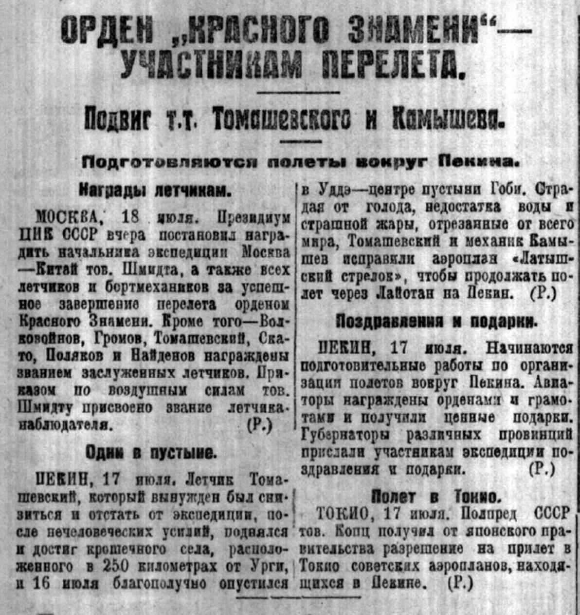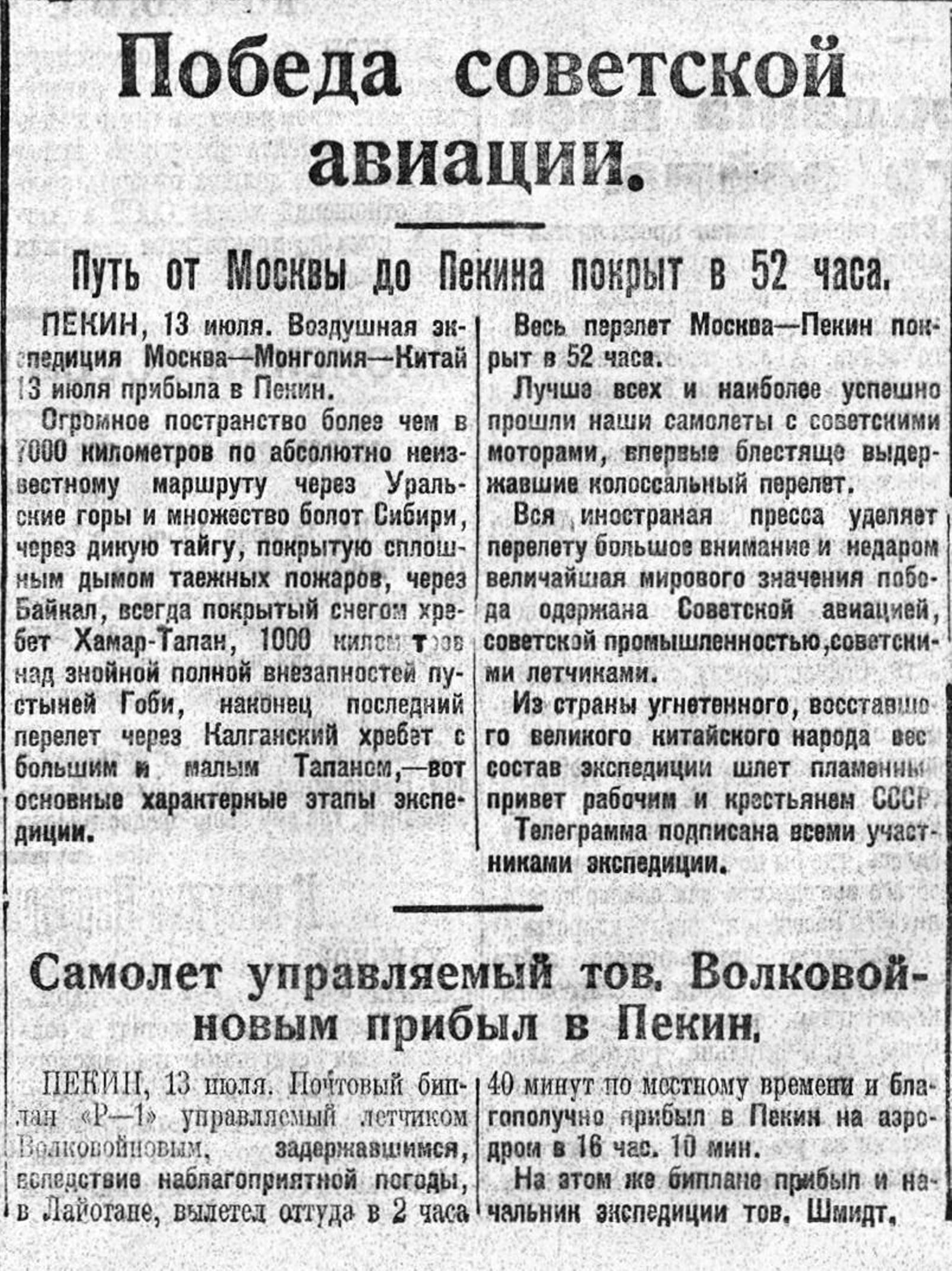 ПЕКИН, 13 июля. 13 июля в 12 час 45 минут по местному времени 3 аэроплана воздушной экспедиции благополучно снизились на пекинском аэродроме в следующем порядке: первым сел «Красный камвольщик» с пилотом Найденовым и механиком Орловым, затем «Р—1» с пилотом Громовым и механиком Радсевичем и наконец «Р—2» с пилотом Екатовым и механиком Мальковым. Четвертый аэроплан, пилотируемый Волковойновым задержался в Лайотань из-за скверной погоды. Там же временно задержался и начальник экспедиции тов. Шмидт.