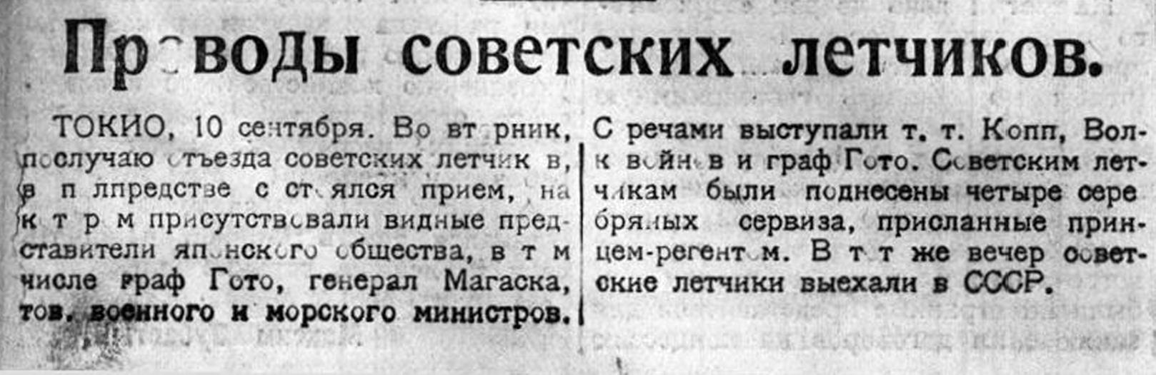 Что касается летчиков, то тут я ничего не могу добавить к тому, что ежедневно пишется в газетах. Для них, повидимому, нет, ничего непреодолимого. Из Пекина два наших самолета пройдут в Японию, в Токио, через Мукден, Сеул и Цусимский пролив, Другие два самолета отправятся во внутренний круговой полет по Китаю.