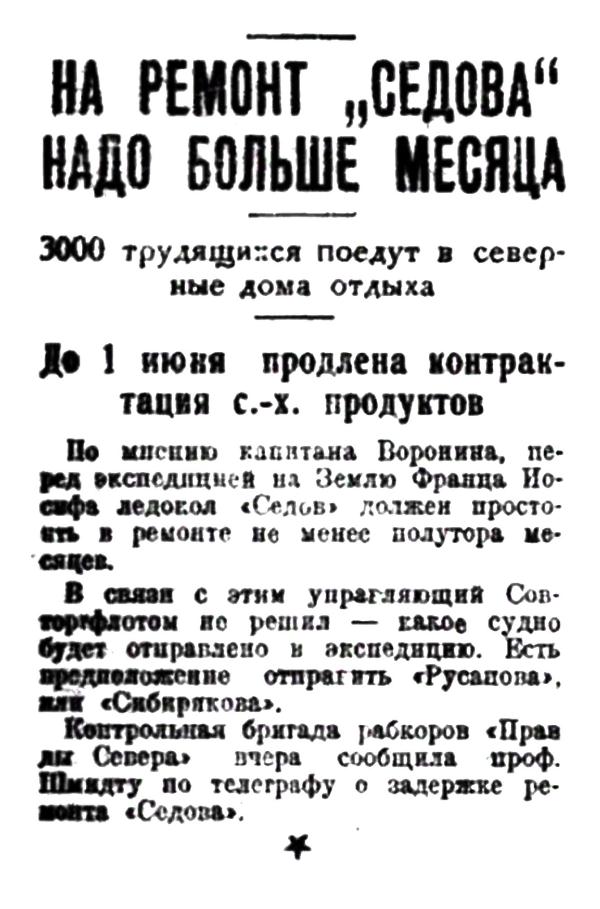 Контрольная бригада рабкоров «Правды Севера» вчера сообщила проф. Шмидту по телеграфу о задержке ремонта "Седова".