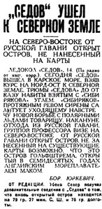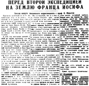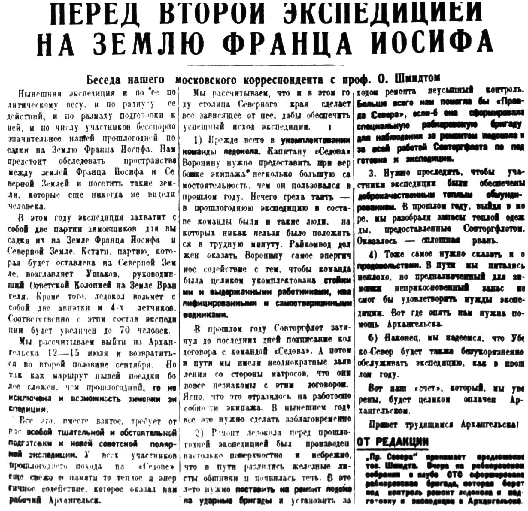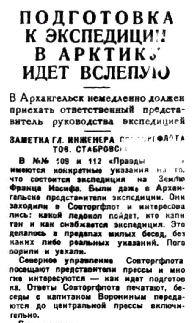 В №№109 и 112 "Правды Севера" имеются конкретные указания на то, что состоится экспедиция на Землю Франца Иосифа. Были даже в Архангельске представители экспедиции. Они заходили в Совторгфлот и интересовались: какой ледокол пойдет, кто капитан и как снабжается экспедиция. Это делалось в пределах милых бесед, без каких либо реальных указаний. Поговорили и уехали.
