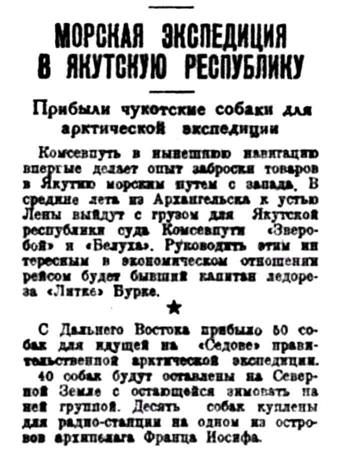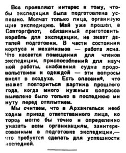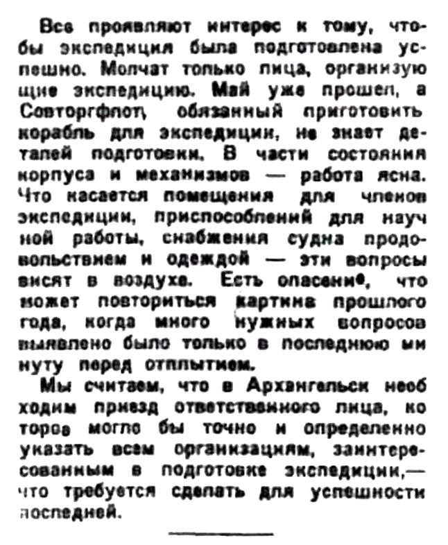 Все проявляют интерес к тому, чтобы экспедиция была подготовлена успешно. Молчат только лица, организующие экспедицию. Май уже прошел, а Совторгфлот, обязанный приготовить корабль для экспедиции, на знает деталей подготовим. В части состояния корпуса и механизмов — работа ясна. Что касается помещения для членов экспедиции, приспособлений для научной работы, снабжения судна продовольствием и одеждой — эти вопросы висят в воздухе. Есть опасения, что может повториться картина прошлого года, когда много нужных вопросов выявлено было только в последнюю минуту перед отплытием.