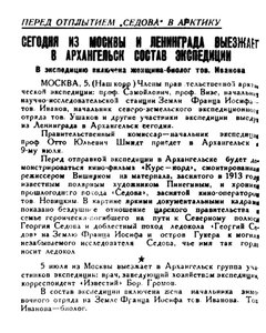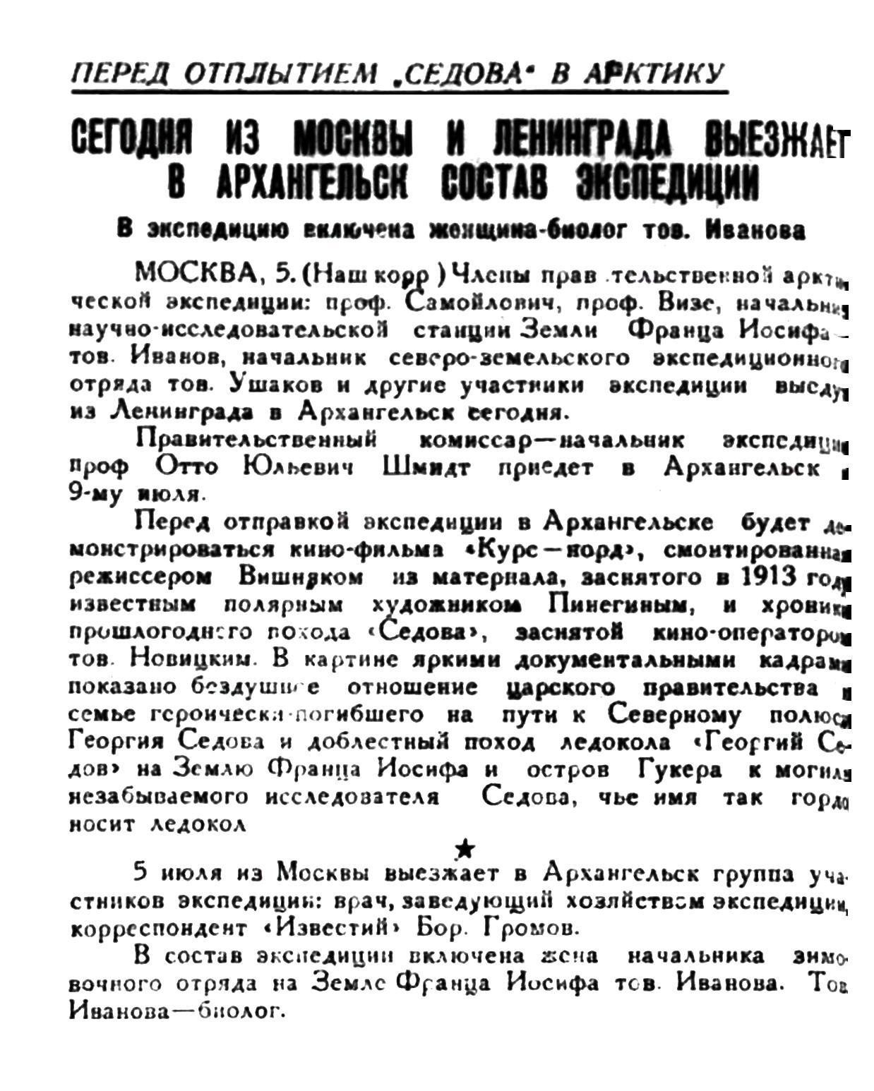 5 июля из Москвы выезжает в Архангельск группа участников экспедиции: врач, заведующий хозяйством экспедиции, корреспондент "Известий" Бор. Громов.