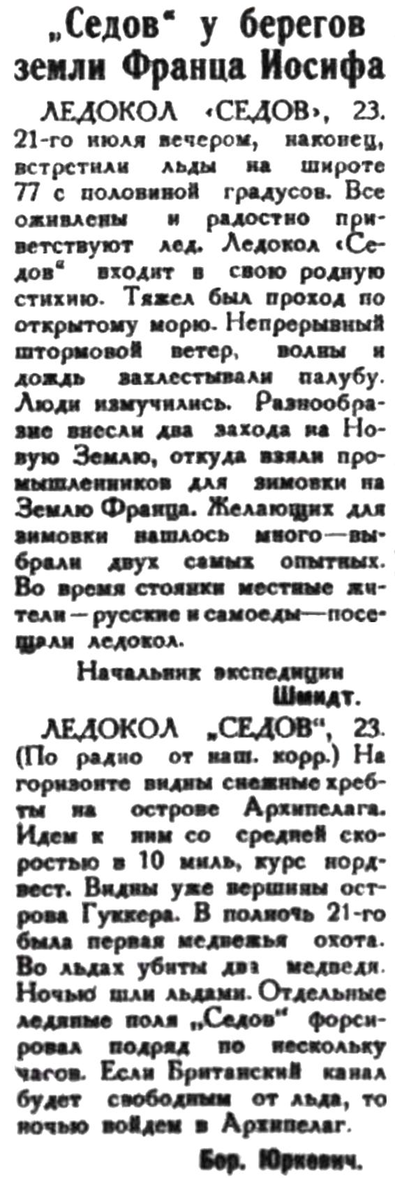 (По радио от наш. корр. ) На горизонте видны снежные хребты на острове Архипелага. Идем к ним со средней скоростью в 10 миль, курс норд-вест. Видны уже вершины острова Гуккера. В полночь 21-го была первая медвежья охота. Во льдах убиты два медведя. Ночью шли льдами. Отдельные ледяные поля "Седов" форсировал подряд по нискольку часов. Если Британский канал будет свободным от льда, то ночью войдем в Архипелаг.