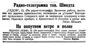 "СЕДОВ", 12. (По радио-телеграфу). Закончив работу, выполняв все задания правительства, экспедиция на "Седове" благодарит организации Северного края за оказанную поддержку и внимание. Надеемся прибыть в Архангельск 14 сентября в конце дня.
