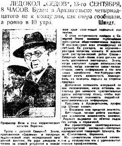 Правительственный комиссар — начальник экспедиции проф. Отто Юльевич Шмидт приедет в Архангельск к 9-му июля.
