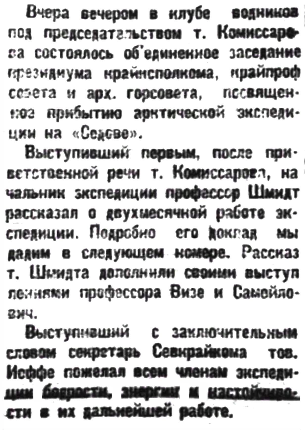 Вчера вечером в клубе водников под председательством т. Комиссарова состоялось объединённое заседание президиума крайисполкома, крайпрофсовета и арх. горсовета, посвященное прибытию арктической экспедиции на "Седове".