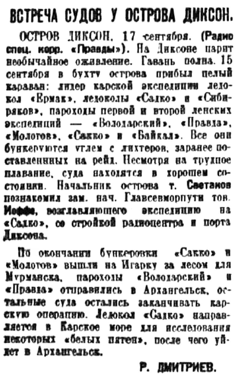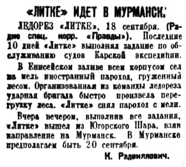 ЛЕДОРЕЗ "ЛИТКЕ", 18 сентября. (Радио спец. корр. "Правды"), Последние 10 дней "Литке" выполнял задание по обслуживанию судов Карской экспедиции.