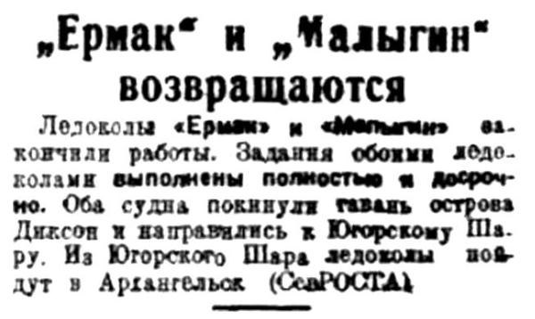 В Енисейском заливе всем корпусом сел на мель иностранный пароход, груженный лесом. Организованная из команды ледореза ударная бригада быстро произвела перегружу леса. "Литке" снял пароход с мели.