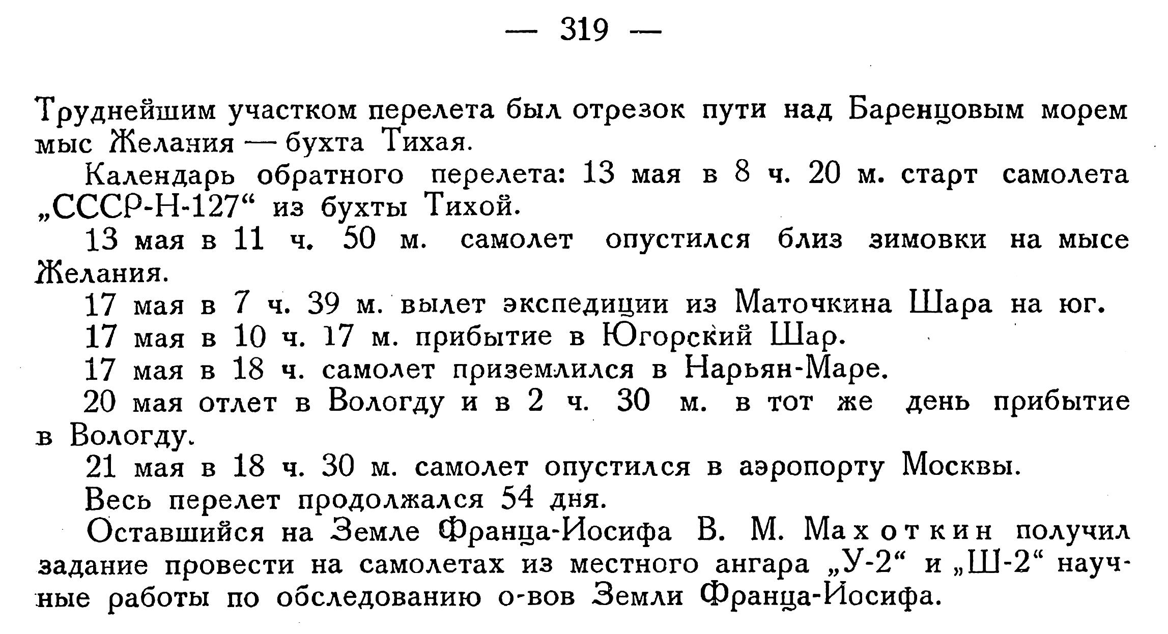 Таким образом был завершен большой и беспримерно трудный арктический перелет Москва — Земля Франца-Иосифа. Этот архипелаг был впервые в истории достигнут на самолетах. Длина пройденного пути составляет почти 4000 км, которые покрыты менее чем за 24 летных часа в довольно суровых условиях полярной погоды. Этот блестящий перелет является новым крупным достижением советской авиации.