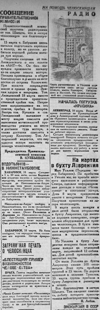 подробности гибели «Челюскина», рас оказали о мерах, принимаемых для спасения «челюскинцев». Беседа вызвала огромный интерес аудитории. Анадырь познакомил своих гостей с творчеством первого «Чукотского национального театра, песнями, танцам чукчей, ламутов».