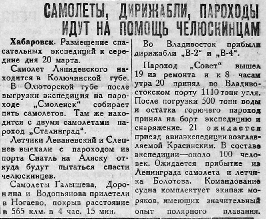 — Правительственная комиссия, — заявил в беседе с владивостокским корреспондентом "Правды", начальник экспедиции дирижаблей тов. Бирнбаум, отправила дирижабли, как резервное средство, если спасение челюскинцев самолетами окажется невозможным.