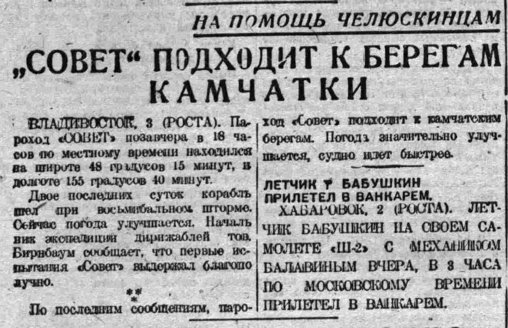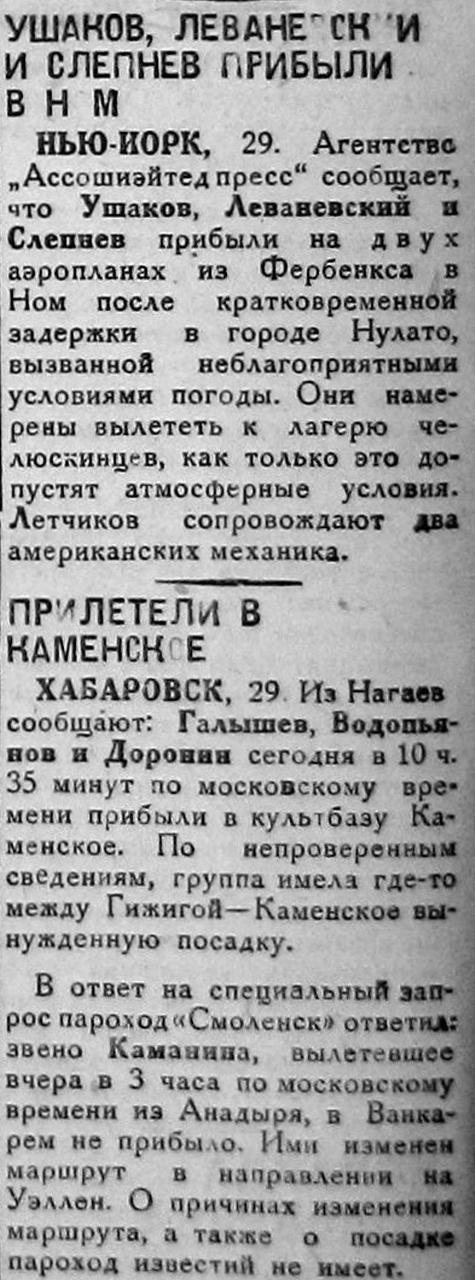 В ответ на специальный запрос пароход "Смоленск" ответил: звено Каманина, вылетевшее вчера в 3 часа по московскому времени из Анадыря, в Ванкарем не прибыло. Ими изменен маршрут в направлении на Уэллен. О причинах изменения маршрута, а также о посадке пароход известий не имеет.